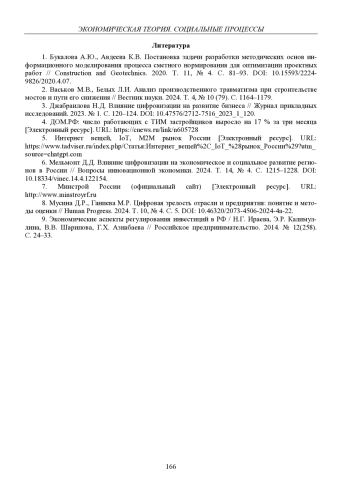 1. 	Букалова А.Ю., Авдеева К.В. Постановка задачи разработки методических основ информационного моделирования процесса сметного нормирования для оптимизации проектных работ // Construction and Geotechnics. 2020. Т. 11, № 4. С. 81-93.  DOI: 10.15593/2224-9826/2020.4.07  EDN: WMJGGQ