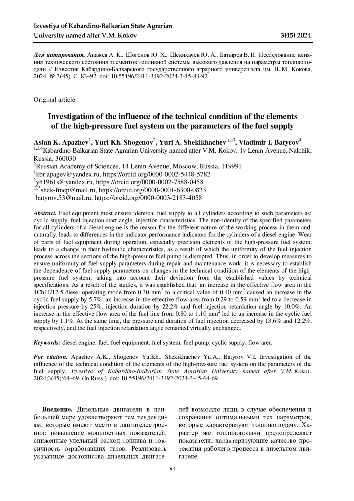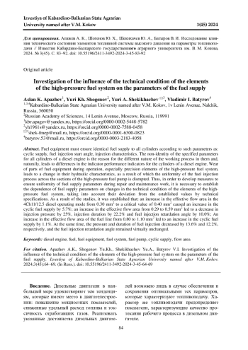 10. 	Батыров В. И., Койчев В. С., Болотоков А. Л. Зависимость параметров топливоподачи от давления в полости питания топливного насоса высокого давления // Научно-технический прогресс в АПК: проблемы и перспективы. Сборник трудов по материалам Международной научно-практической конференции, в рамках XVIII Международной агропромышленной выставки “Агроуниверсал - 2016”. Ставрополь: Изд-во “Агрус”, 2016. С. 252-256. EDN: WBHSPV