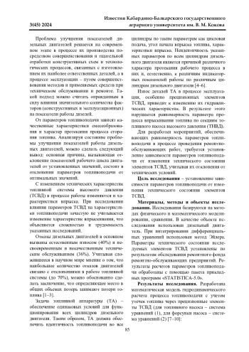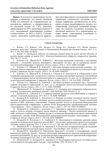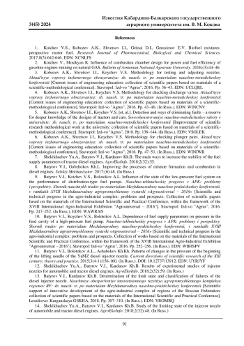 7. 	Шекихачев Ю. А., Батыров В. И., Карданов Х. Б. Основные пути повышения стабильности параметров топливоподачи тракторных дизелей // АгроЭкоИнфо. 2018. № 2(32). С. 55. EDN: UTXEVN