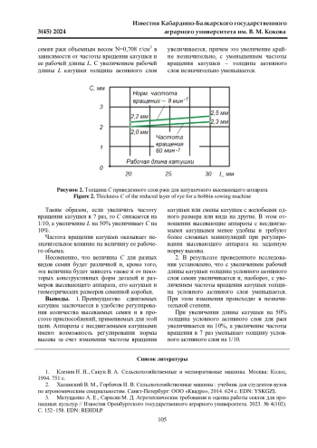 В данной работе приведены результаты теоретического исследования рабочего процесса катушечного высевающего аппарата зерновой сеялки. Целью исследования являлось установление степени влияния основных параметров катушки (размеров, частоты вращения, числа и форм ее желобков) высевающего аппарата зерновой сеялки на действительную толщину условного слоя, формирующегося при движении семян в активном потоке. При установлении факторов, связанных с расчетом катушечного высевающего аппарата на высев заданных норм, учитываются условия работы посевного агрегата и агротехнические требования, предъявляемые к ней как к машине сельскохозяйственного назначения. Важное значение также имеют и характерные особенности посевного материала. По физикомеханическим свойствам (форме, весу, геометрическим параметрам отдельных зерен, объемному весу, свойствам сыпучести) семенной материал может сильно отличаться и зависеть не только от вида и сорта культуры, но и от года сбора урожая, местности произрастания культуры, качества очистки и сортирования семенного материала. В результате проведенного исследования установлено, что с увеличением рабочей длины катушки толщина условного активного слоя семян увеличивается и, наоборот, с увеличением частоты вращения катушки толщина условного активного слоя уменьшается. При этом изменения происходят в незначительной степени.