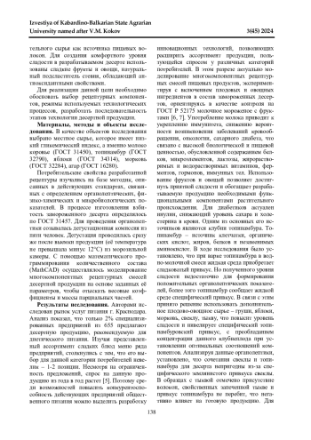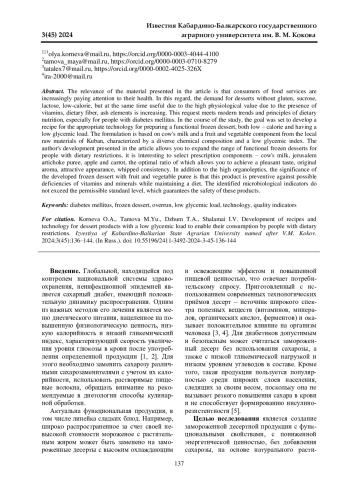 Актуальность представленного материала в статье в том, что потребители услуг питания всѐ больше уделяют внимание своему здоровью. В связи с этим увеличивается спрос на десерты без глютена, сахарозы, лактозы, низкокалорийные, но в то же время полезные в связи с высокой физиологической ценностью, обусловленной наличием витаминов, пищевых волокон, зольных элементов. Этот запрос отвечает современным трендам и принципам диетического питания, особенно лиц, страдающих сахарным диабетом. В ходе исследования поставлена цель - разработать рецептуру, соответствующую ей технологию приготовления функционального замороженного десерта как низкокалорийного, так и имеющего низкую гликемическую нагрузку. Рецептура базируется на коровьем молоке и фруктовоовощном компоненте из местного сырья Кубани, характеризующегося разнообразным химическим составом и низким гликемическим индексом. Представленная в статье авторская разработка позволяет расширить ассортимент функциональных замороженных десертов для лиц с ограничением в питании, интересна подбором рецептурных компонентов - коровьего молока, пюре из топинамбура, яблочного и морковного, оптимальное соотношение которых позволяет достичь приятный вкус, оригинальный аромат, привлекательный внешний вид, взбитую консистенцию. Помимо высокой органолептики, значимость разработанного замороженного десерта с плодово-овощным пюре в том, что это изделие профилактическое в отношении возможных дефицитов витаминов и минеральных веществ при поддержании диеты. Выявленные микробиологические показатели не превышают допустимого стандартного уровня, что гарантирует безопасность данной продукции.