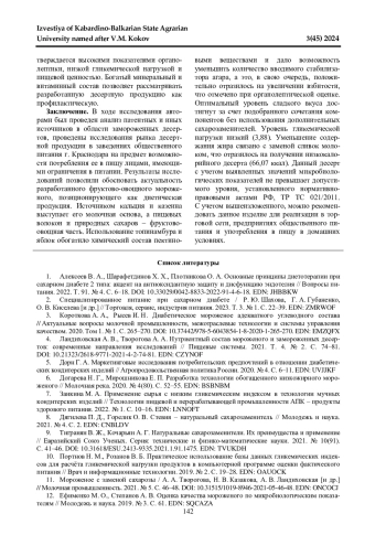 3. 	Короткова А. А., Рысев И. Н. Диабетическое мороженое адекватного углеводного состава // Актуальные вопросы молочной промышленности, межотраслевые технологии и системы управления качеством. 2020. Том 1. № 1. С. 265-270. DOI: 10.37442/978-5-6043854-1-8-2020-1-265-270 EDN: EMZQFX