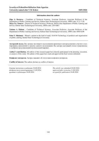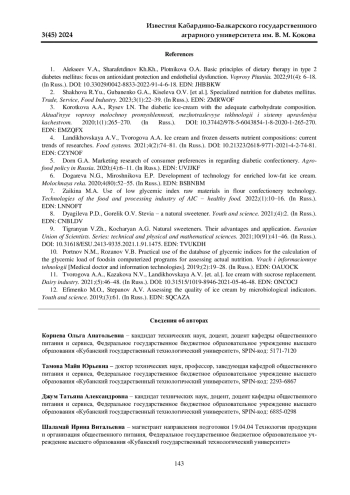 2. 	Специализированное питание при сахарном диабете / Р. Ю. Шахова, Г. А. Губаненко, О. В. Киселева [и др.] // Торговля, сервис, индустрия питания. 2023. Т. 3. № 1. С. 22-39. EDN: ZMRWOF