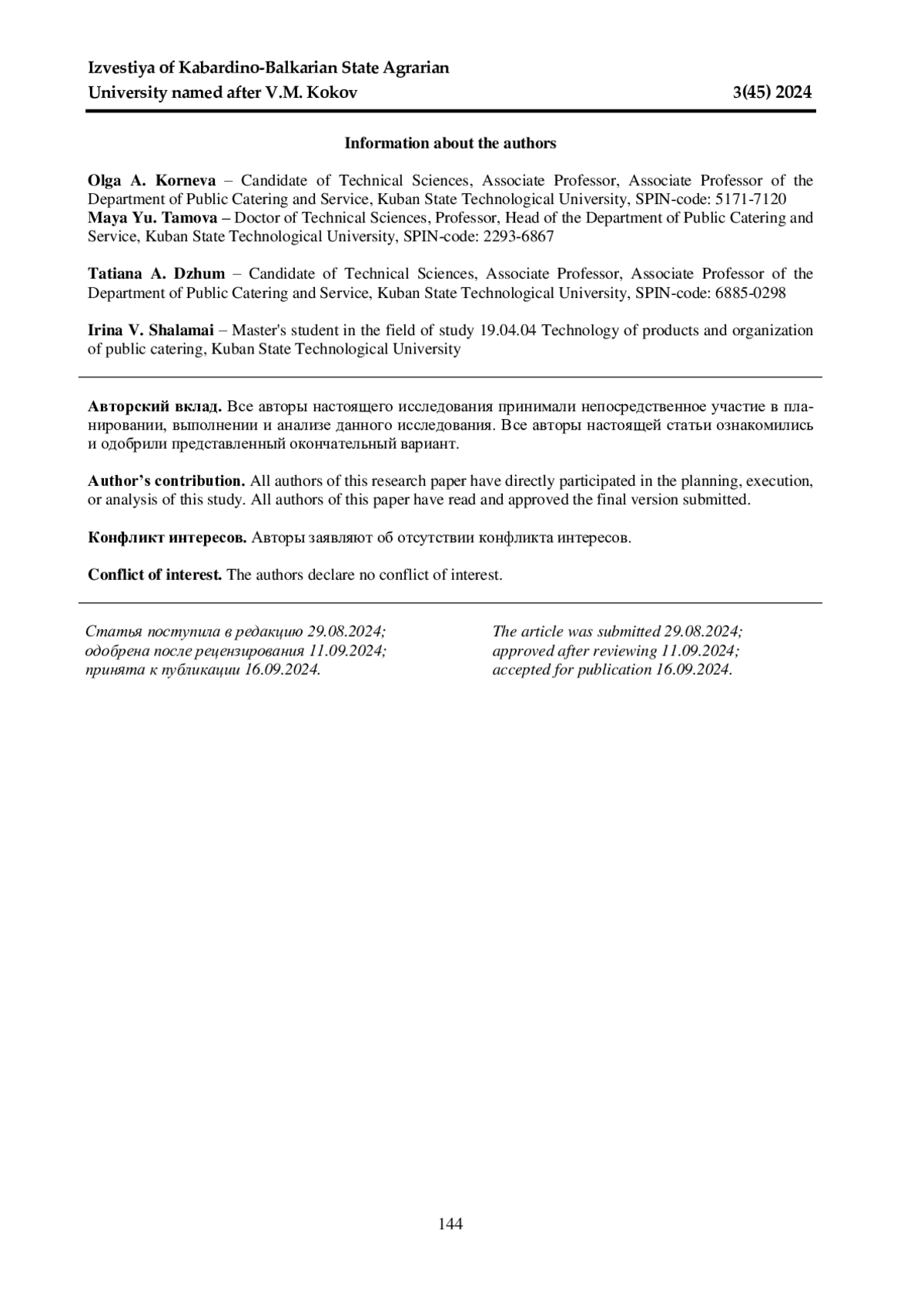 Целью исследований явилась разработка технологии сладких блюд с использованием отвара из зернобобовых - аквафабы и оценка их потребительских свойств. Сравнительная оценка качества аквафабы из фасоли белой, фасоли красной, чечевицы, нута и бобов эдамаме, получаемых в специализированном цехе сети ресторанов «LUBO» г. Краснодар, показала, что наилучшими органолептическими и пенообразующими свойствами обладает аквафаба из бобов эдамаме. В сравнении с контрольным образцом, взбитость аквафабы из бобов эдамаме была выше на 19,5%. Установлено, что аквафаба из бобов эдамаме содержит 4,62% белка, 10,6% углеводов, более 4,5% органических кислот, богата минеральными веществами: калием - 278,80 мг%, натрием - 267,50 мг%, кальцием - 47,50 мг%, магнием - 34,20 мг%, фосфором - 92,00 мг%, а также содержит цинк, медь и др., что обосновывает целесообразность еѐ использования в производстве сладких блюд со взбивной структурой. Исследовали влияние температуры взбивания от плюс 4 С до плюс 55˚С, продолжительности взбивания от 5 до 15 мин и интенсивности взбивания от 600 до 1000 об/мин на органолептическую оценку, взбитость и устойчивость пены через 30 мин аквафабы из бобов эдамаме. Регрессионный анализ проводили в Statistica v.10, решение задачи математического программирования - в MathCAD v.15. Установлены оптимальные параметры взбивания аквафабы из бобов эдамаме: температура плюс 4 С, продолжительность взбивания 10 мин, интенсивность взбивания 1000 об/мин. С учетом этого разработаны технология и рецептуры ягодных муссов с аквафабой. Исследованы показатели качества мусса из чѐрной смородины и мусса из малины с аквафабой. Установлено, что через сутки хранения при температуре плюс 6 С они не изменили структурные и вкусовые характеристики. Разработанная продукция соответствуют гигиеническим нормативам по показателям качества и пищевой безопасности ТР ТС 021/2011. Благодаря отсутствию яйцепродуктов, лактозы и глютена, данная продукция может использоваться в диетическом питании. Практическая значимость исследования состоит в адаптации технологических режимов производства муссов с аквафабой к условиям предприятий общественного питания.