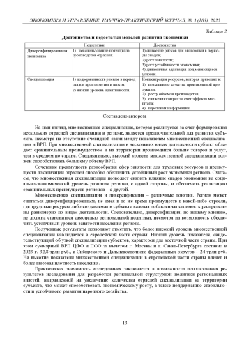 Выбор наиболее эффективной модели развития в современных условиях – одна из важнейших задач, которая стоит перед региональными властями. В течение продолжительного времени противопоставление диверсификации и специализации экономики было единственным вариантом научных исследований. Мы предлагаем рассмотреть преимущества обеих моделей развития при их параллельной реализации в рамках использования так называемой множественной специализации. Рассчитаны коэффициенты специализации и индексы множественной специализации по регионам Российской Федерации за 2007 и 2023 гг. Обнаружена слабая корреляционная зависимость между изменением уровня множественной специализации и ВРП за 2007 и 2023 гг. Множественная специализация, которая реализуется за счет формирования нескольких отраслей специализации в регионе, является предпочтительной для устойчивого и эффективного развития субъекта