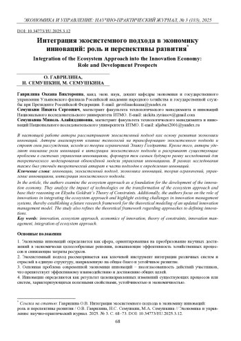 В настоящей работе авторы рассматривают экосистемный подход как основу развития экономики инноваций. Авторы анализируют влияние технологий на трансформацию экосистемного подхода и строят свои рассуждения, исходя из теории ограничений Элияху Голдратта. Кроме того, авторы уделяют внимание роли инноваций в интеграции экосистемного подхода и раскрывают существующие проблемы в системах управления инновациями, формируя тем самым будущую рамку исследований для теоретического моделирования обновлённой модели управления инновациями. В рамках исследования также был уточнён теоретический аппарат в части подходов к определению инноваций