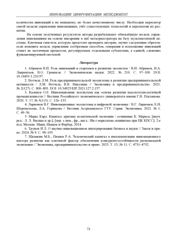 4. Ларионов В.Г. Инновационные экосистемы в цифровой экономике / В.Г. Ларионов, Е.Н. Шереметьева, Л.А. Горшкова // Вестник Астраханского ГТУ. Серия: Экономика. 2021. № 1. С. 49-56. EDN: RSKEDU