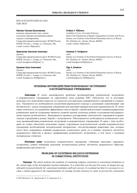 4. Михеева С. В. Некоторые вопросы религиозного экстремизма в пенитенциарных учреждениях России // Правовая культура в современном обществе: сборник научных работ. Могилев, 2019. С. 294-297. EDN: WGDGPA
