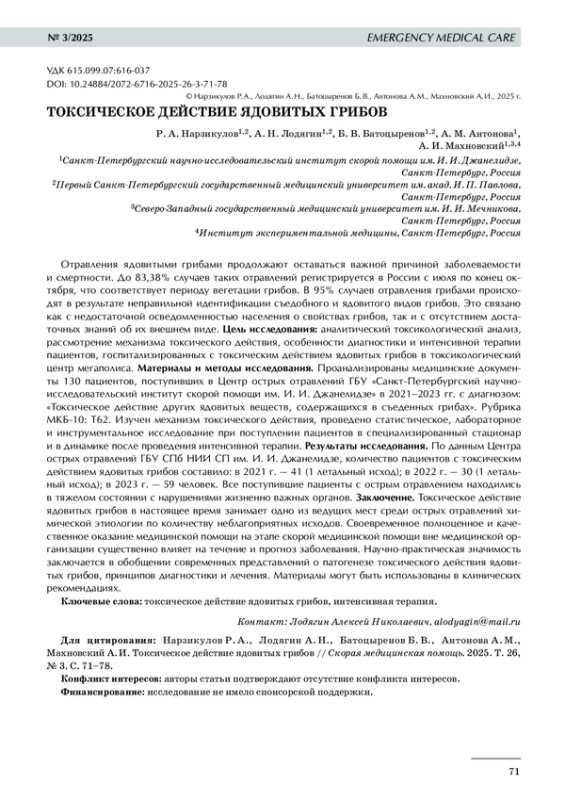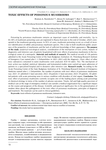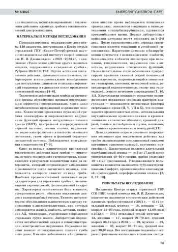 Отравления ядовитыми грибами продолжают оставаться важной причиной заболеваемости и смертности. До 83,38% случаев таких отравлений регистрируется в России с июля по конец октября, что соответствует периоду вегетации грибов. В 95% случаев отравления грибами происходят в результате неправильной идентификации съедобного и ядовитого видов грибов. Это связано как с недостаточной осведомленностью населения о свой ствах грибов, так и с отсутствием достаточных знаний об их внешнем виде. Цель исследования: аналитический токсикологический анализ, рассмотрение механизма токсического действия, особенности диагностики и интенсивной терапии пациентов, госпитализированных с токсическим действием ядовитых грибов в токсикологический центр мегаполиса. Материалы и методы исследования. Проанализированы медицинские документы 130 пациентов, поступивших в Центр острых отравлений ГБУ «Санкт- Петербургский научноисследовательский институт скорой помощи им. И. И. Джанелидзе» в 2021–2023 гг. с диагнозом: «Токсическое действие других ядовитых веществ, содержащихся в съеденных грибах». Рубрика МКБ-10: Т62. Изучен механизм токсического действия, проведено статистическое, лабораторное и инструментальное исследование при поступлении пациентов в специализированный стационар и в динамике после проведения интенсивной терапии. Результаты исследования. По данным Центра острых отравлений ГБУ СПб НИИ СП им. И. И. Джанелидзе, количество пациентов с токсическим действием ядовитых грибов составило: в 2021 г. — 41 (1 летальный исход); в 2022 г. — 30 (1 летальный исход); в 2023 г. — 59 человек. Все поступившие пациенты с острым отравлением находились в тяжелом состоянии с нарушениями жизненно важных органов. Заключение. Токсическое действие ядовитых грибов в настоящее время занимает одно из ведущих мест среди острых отравлений химической этиологии по количеству неблагоприятных исходов. Своевременное полноценное и качественное оказание медицинской помощи на этапе скорой медицинской помощи вне медицинской организации существенно влияет на течение и прогноз заболевания. Научно- практическая значимость заключается в обобщении современных представлений о патогенезе токсического действия ядовитых грибов, принципов диагностики и лечения. Материалы могут быть использованы в клинических рекомендациях.