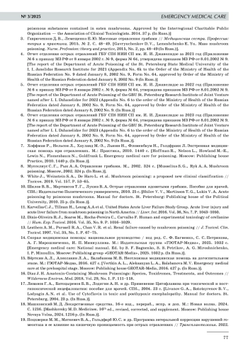 16. 	Diaz J. H. Amatoxin-Containing Mushroom Poisonings: Species, Toxidromes, Treatments, and Outcomes // Wilderness Environ. Med. 2018. Vol. 29, No. 1. P. 111-118.