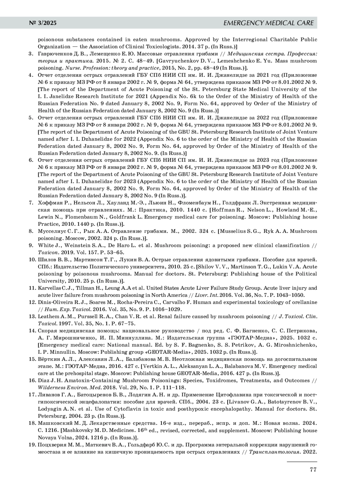 Shilov V. V., Martinson T. G., Lukin V. A. Acute poisoning by poisonous mushrooms. Manual for doctors. St. Petersburg: Publishing house of the Political University, 2010. 25 p. (In Russ.).