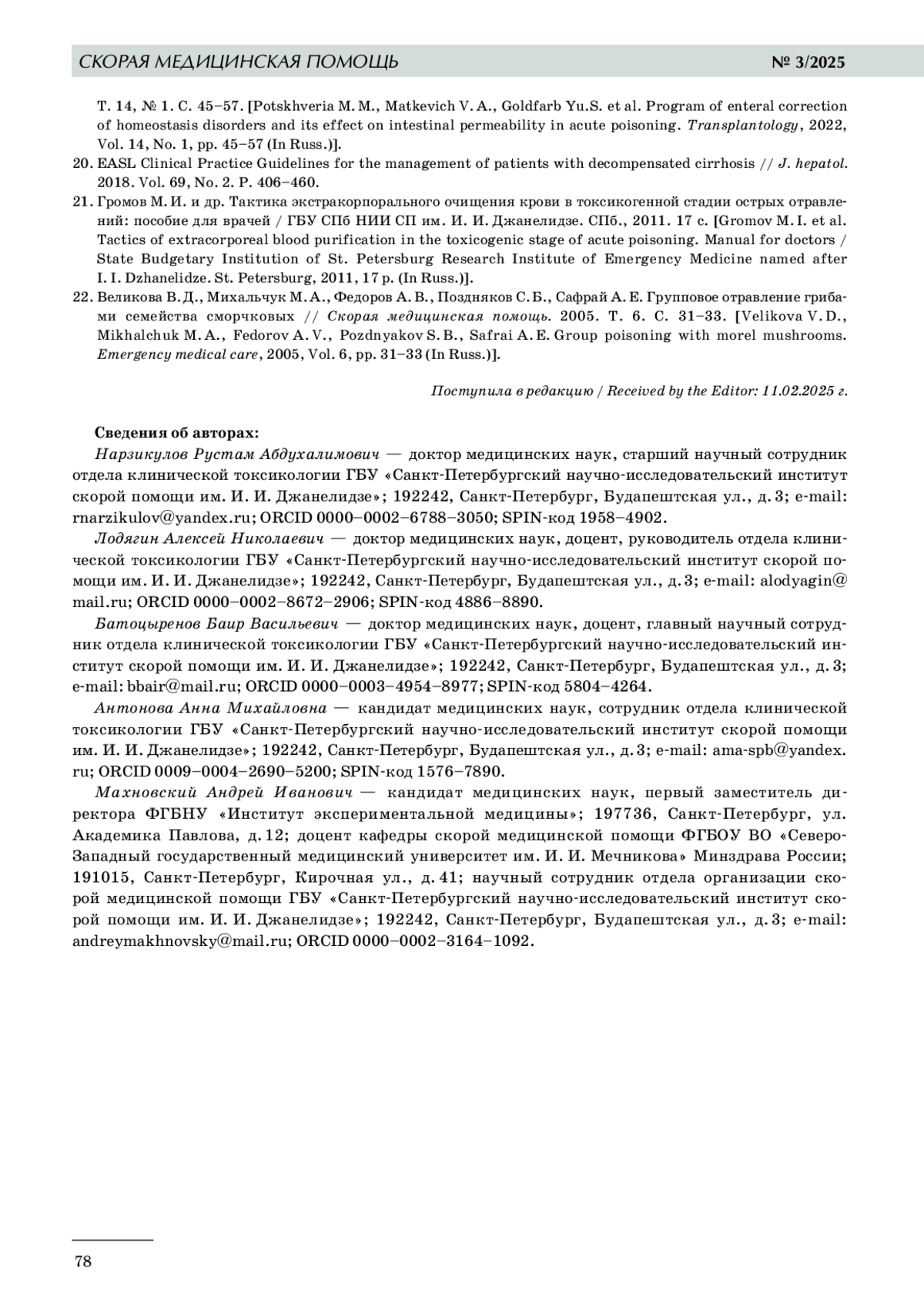 Velikova V. D., Mikhalchuk M. A., Fedorov A. V., Pozdnyakov S. B., Safrai A. E. Group poisoning with morel mushrooms. Emergency medical care, 2005, Vol. 6, рр. 31-33 (In Russ.).