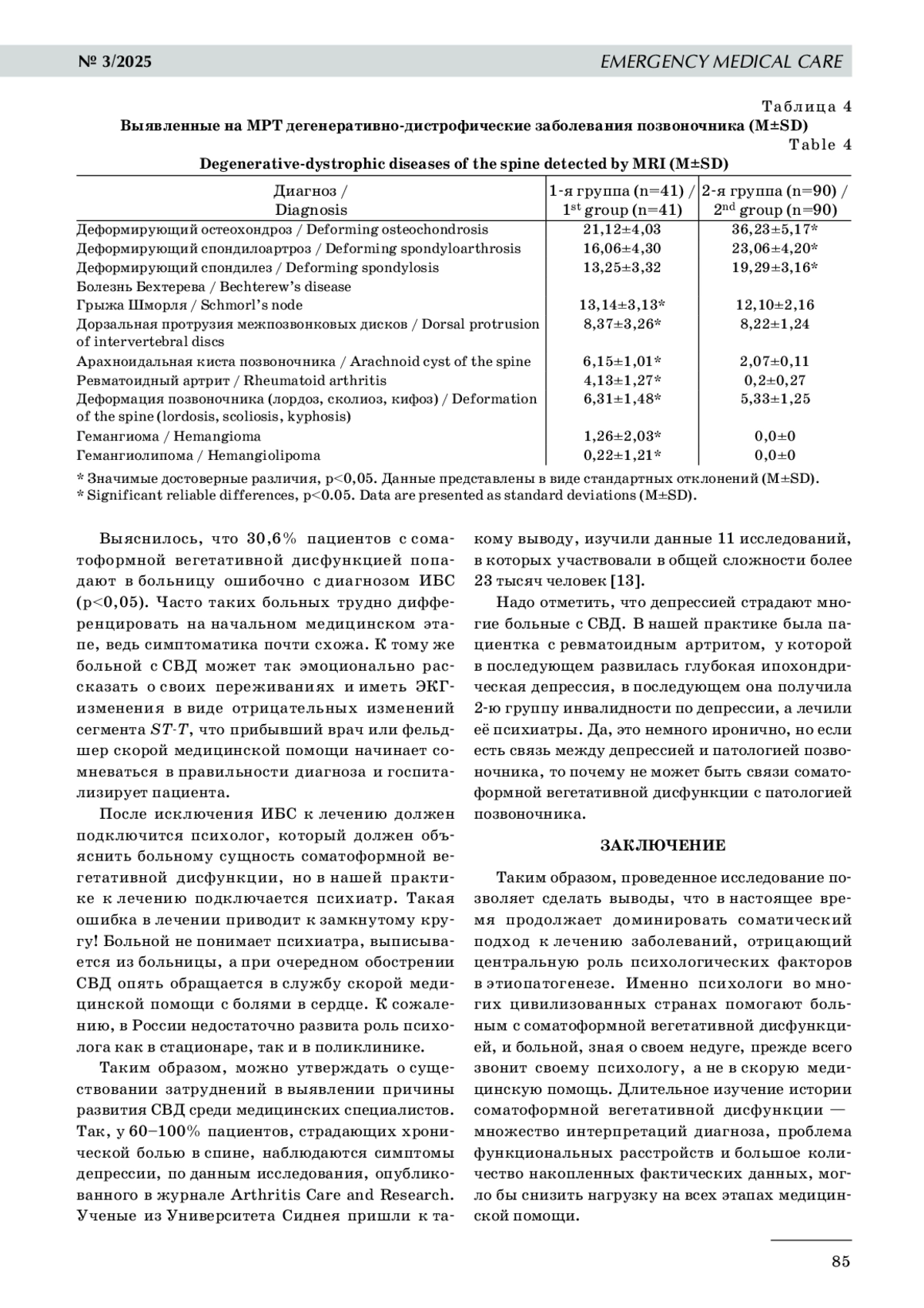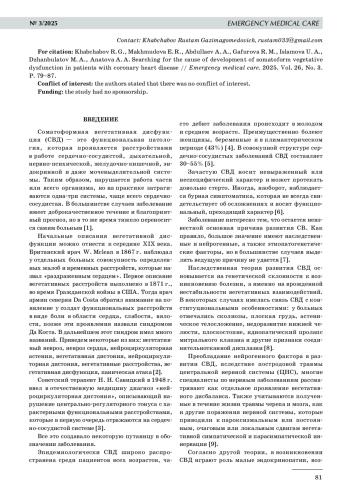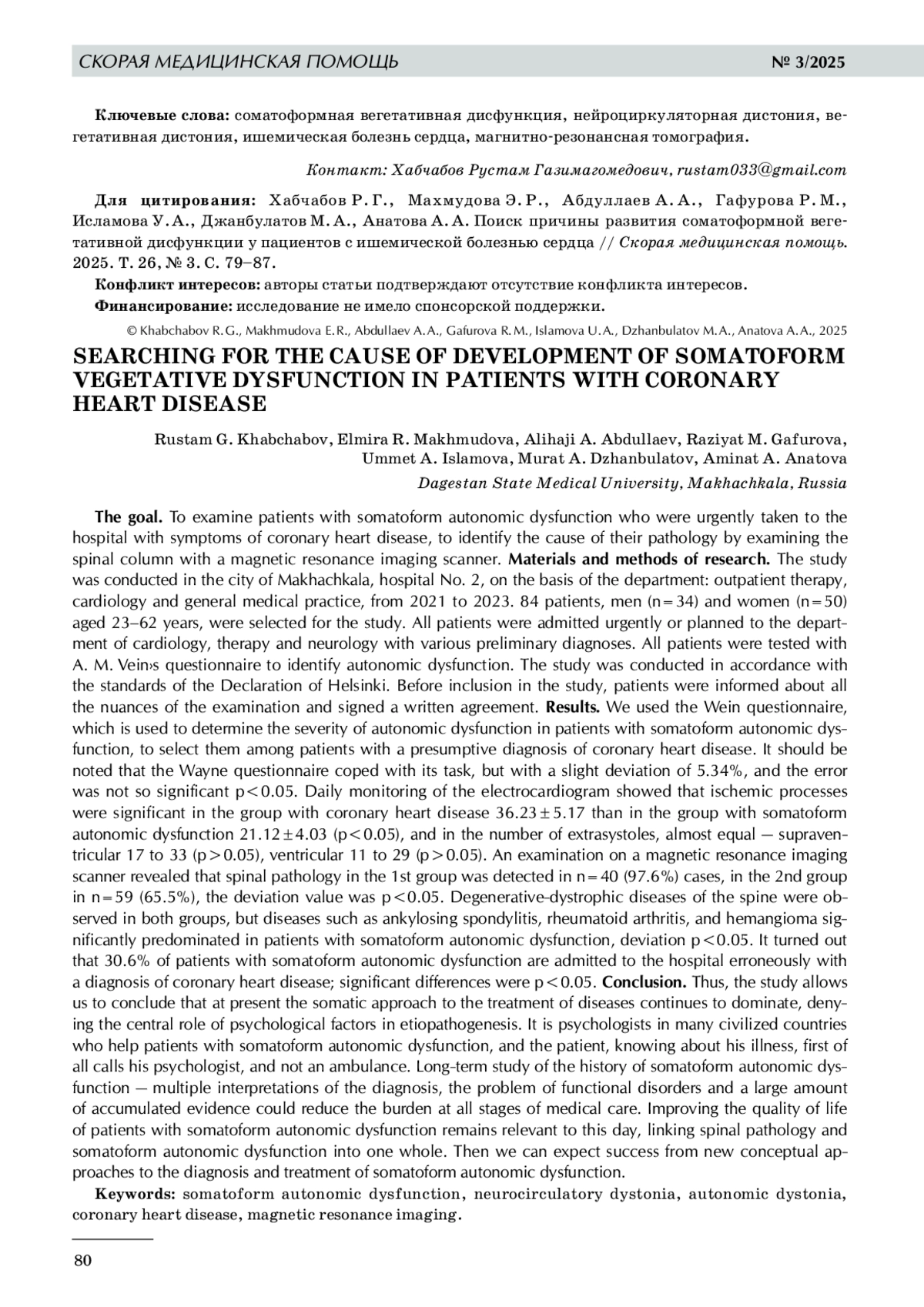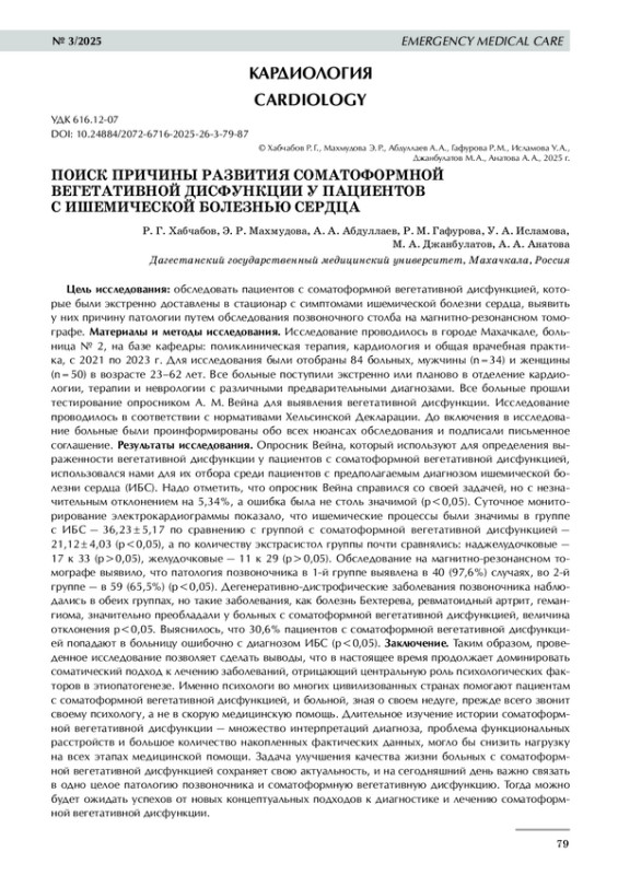 Цель исследования: обследовать пациентов с соматоформной вегетативной дисфункцией, которые были экстренно доставлены в стационар с симптомами ишемической болезни сердца, выявить у них причину патологии путем обследования позвоночного столба на магнитно- резонансном томографе. Материалы и методы исследования. Исследование проводилось в городе Махачкале, больница № 2, на базе кафедры: поликлиническая терапия, кардиология и общая врачебная практика, с 2021 по 2023 г. Для исследования были отобраны 84 больных, мужчины (n=34) и женщины (n=50) в возрасте 23–62 лет. Все больные поступили экстренно или планово в отделение кардиологии, терапии и неврологии с различными предварительными диагнозами. Все больные прошли тестирование опросником А. М. Вейна для выявления вегетативной дисфункции. Исследование проводилось в соответствии с нормативами Хельсинской Декларации. До включения в исследование больные были проинформированы обо всех нюансах обследования и подписали письменное соглашение. Результаты исследования. Опросник Вейна, который используют для определения выраженности вегетативной дисфункции у пациентов с соматоформной вегетативной дисфункцией, использовался нами для их отбора среди пациентов с предполагаемым диагнозом ишемической болезни сердца (ИБС). Надо отметить, что опросник Вейна справился со своей задачей, но с незначительным отклонением на 5,34%, а ошибка была не столь значимой (р<0,05). Суточное мониторирование электрокардиограммы показало, что ишемические процессы были значимы в группе с ИБС — 36,23±5,17 по сравнению с группой с соматоформной вегетативной дисфункцией — 21,12±4,03 (p<0,05), а по количеству экстрасистол группы почти сравнялись: наджелудочковые — 17 к 33 (p>0,05), желудочковые — 11 к 29 (p>0,05). Обследование на магнитно- резонансном томографе выявило, что патология позвоночника в 1-й группе выявлена в 40 (97,6%) случаях, во 2-й группе — в 59 (65,5%) (р<0,05). Дегенеративно- дистрофические заболевания позвоночника наблюдались в обеих группах, но такие заболевания, как болезнь Бехтерева, ревматоидный артрит, гемангиома, значительно преобладали у больных с соматоформной вегетативной дисфункцией, величина отклонения р<0,05. Выяснилось, что 30,6% пациентов с соматоформной вегетативной дисфункцией попадают в больницу ошибочно с диагнозом ИБС (р<0,05). Заключение. Таким образом, проведенное исследование позволяет сделать выводы, что в настоящее время продолжает доминировать соматический подход к лечению заболеваний, отрицающий центральную роль психологических факторов в этиопатогенезе. Именно психологи во многих цивилизованных странах помогают пациентам с соматоформной вегетативной дисфункцией, и больной, зная о своем недуге, прежде всего звонит своему психологу, а не в скорую медицинскую помощь. Длительное изучение истории соматоформной вегетативной дисфункции — множество интерпретаций диагноза, проблема функциональных расстройств и большое количество накопленных фактических данных, могло бы снизить нагрузку на всех этапах медицинской помощи. Задача улучшения качества жизни больных с соматоформной вегетативной дисфункцией сохраняет свою актуальность, и на сегодняшний день важно связать в одно целое патологию позвоночника и соматоформную вегетативную дисфункцию. Тогда можно будет ожидать успехов от новых концептуальных подходо