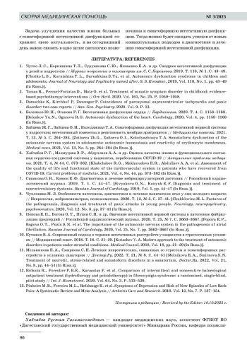 1. 	Чутко Л. С., Корнишина Т. Л., Сурушкина С. Ю., Яковенко Е. А. и др. Синдром вегетативной дисфункции у детей и подростков // Журнал неврологии и психиатрии им. С. С. Корсакова. 2019. Т. 118, № 1. С. 43-49.