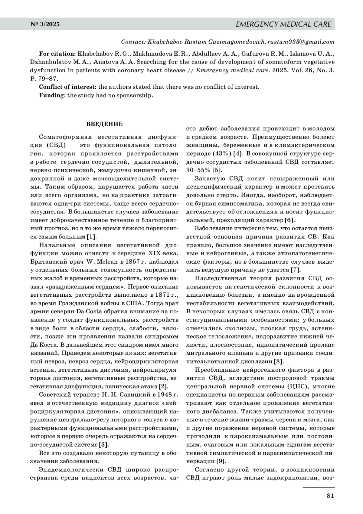 Zaitseva Zh.G., Zaitseva O. I., Kolodyazhnaya T. A. Somatoform dysfunction of the autonomic nervous system in adolescents: autonomic homeostasis and reactivity of erythrocyte membranes. Medical news, 2021, Vol. 13, No. 5, pp. 264-284 (In Russ.).