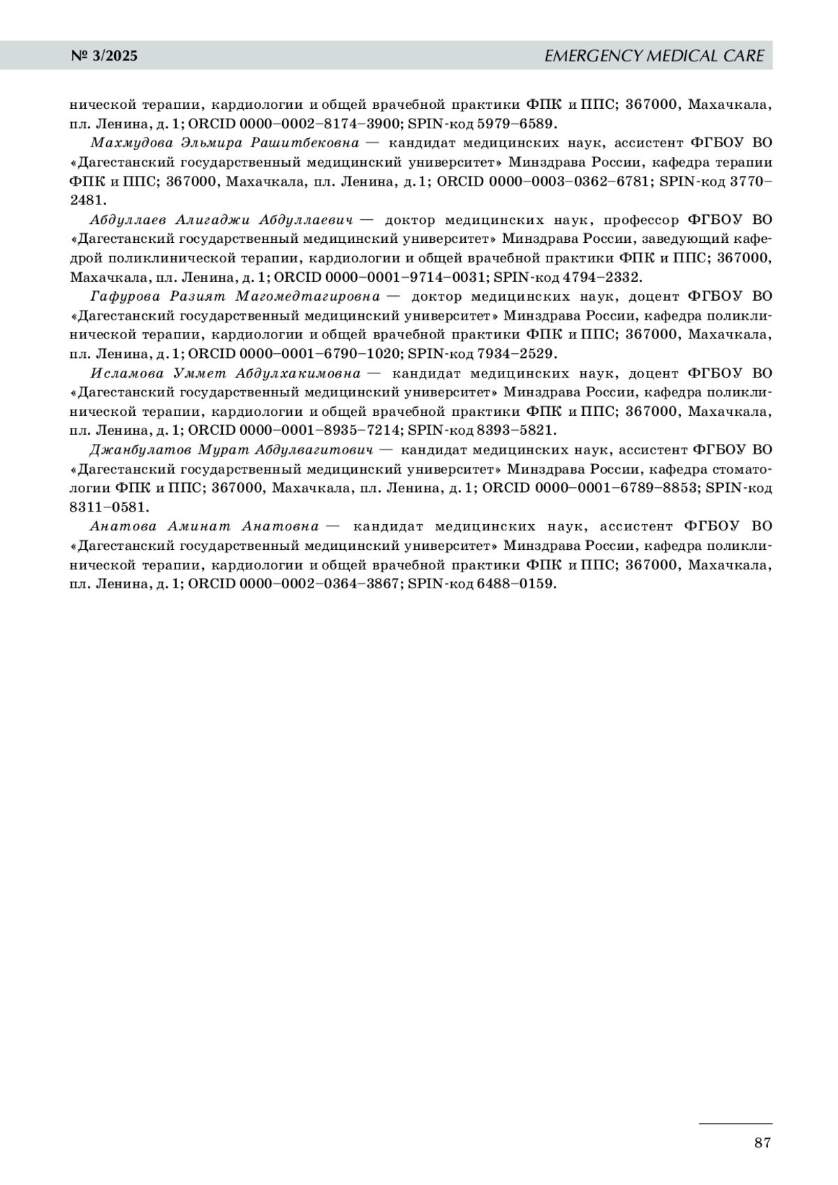 6. 	Хабчабов Р. Г., Махмудова Э. Р., Абдуллаев А. А. и др. Оценка качества жизни и функционального состояния сердечно-сосудистой системы у пациентов, переболевших COVID-19 // Актуальные проблемы медицины. 2021. Т. 4, № 44. С. 373-382.