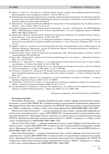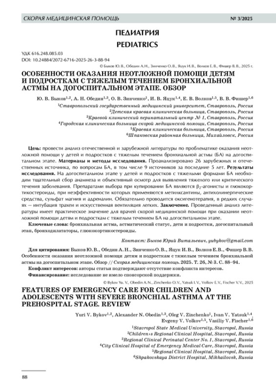 БЫКОВ Ю. В., ОБЕДИН А. Н., ЗИНЧЕНКО О. В., ЯЦУК И. В., ВОЛКОВ Е. В., ФИШЕР В. В. ОСОБЕННОСТИ ОКАЗАНИЯ НЕОТЛОЖНОЙ ПОМОЩИ ДЕТЯМ И ПОДРОСТКАМ С ТЯЖЕЛЫМ ТЕЧЕНИЕМ БРОНХИАЛЬНОЙ АСТМЫ НА ДОГОСПИТАЛЬНОМ ЭТАПЕ. ОБЗОР // СКОРАЯ МЕДИЦИНСКАЯ ПОМОЩЬ. 2025. № 3, ТОМ 26