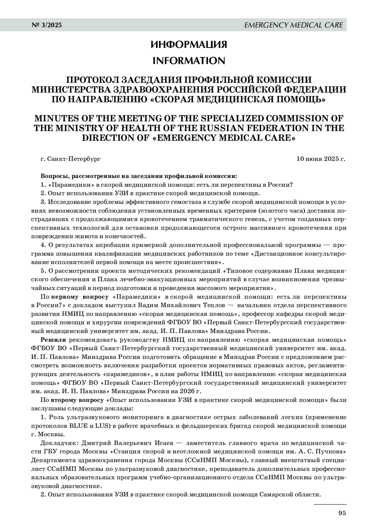 По первому вопросу «Парамедики» в скорой медицинской помощи: есть ли перспективы в России?» с докладом выступил Вадим Михайлович Теплов — начальник отдела перспективного развития НМИЦ по направлению «скорая медицинская помощь», профессор кафедры скорой медицинской помощи и хирургии повреждений ФГБОУ ВО «Первый Санкт- Петербургский государственный медицинский университет им. акад. И. П. Павлова» Минздрава России.