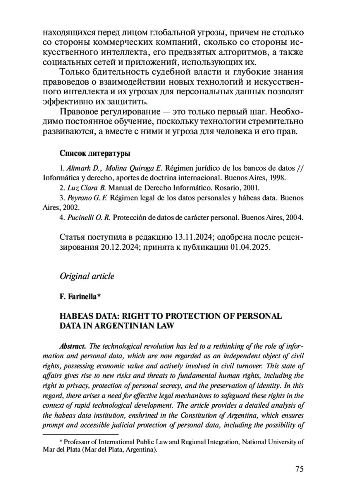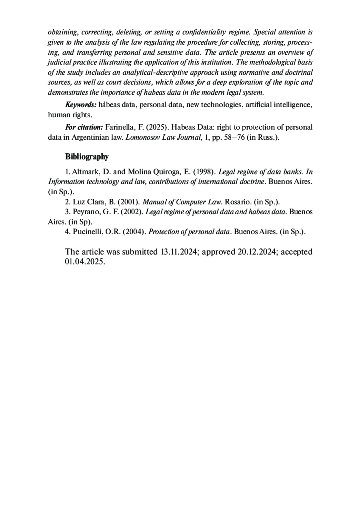 ФАРИНЕЛЛА Ф. ХАБЕАС ДАТА: ПРАВО НА ЗАЩИТУ ПЕРСОНАЛЬНЫХ ДАННЫХ В АРГЕНТИНСКОМ ПРАВЕ // ВЕСТНИК МОСКОВСКОГО УНИВЕРСИТЕТА. СЕРИЯ 11: ПРАВО. 2025. № 1