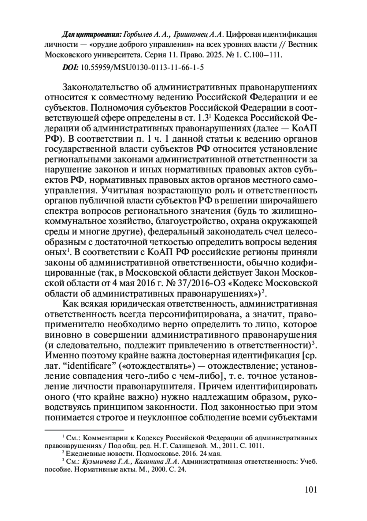 В статье рассматривается проблема вовлечения региональных и муниципальных органов контроля и надзора (и их должностных лиц) в процесс цифровой идентификации личности граждан. Обозначены факторы, которыми обусловлена потребность идентификации личности человека. Рассматриваются предусмотренные законодательством Российской Федерации случаи и основания, когда идентификация личности лица является обязательной. Отмечается, что наибольшими по объему и содержанию полномочиями в области проверки удостоверяющих личность документов наделена полиция. Правомочиями по удостоверению личности наделены не только государственные органы, но в ряде случаев даже частные лица, например продавцы(кассиры) при продаже табачных изделий и алкогольной продукции. Напротив, федеральное законодательство до настоящего времени не предоставило право проверять документы, удостоверяющие личность, сотрудникам контрольно-надзорных органов, в том числе регионального и муниципального уровня. В качестве предмета для дальнейшей научно-практической дискуссии на основе зарубежного опыта предложен поэтапный порядок проведения идентификация личности административных правонарушителей с использованием цифровых технологий. Делается вывод о необходимости значимой нормативной трансформации, необходимой для надлежащего юридического обеспечения привлечения к административной ответственности с использованием электронных технологий идентификации личности в рамках административно-юрисдикционной деятельности (в том числе региональных и муниципальных контрольно-надзорных органов).