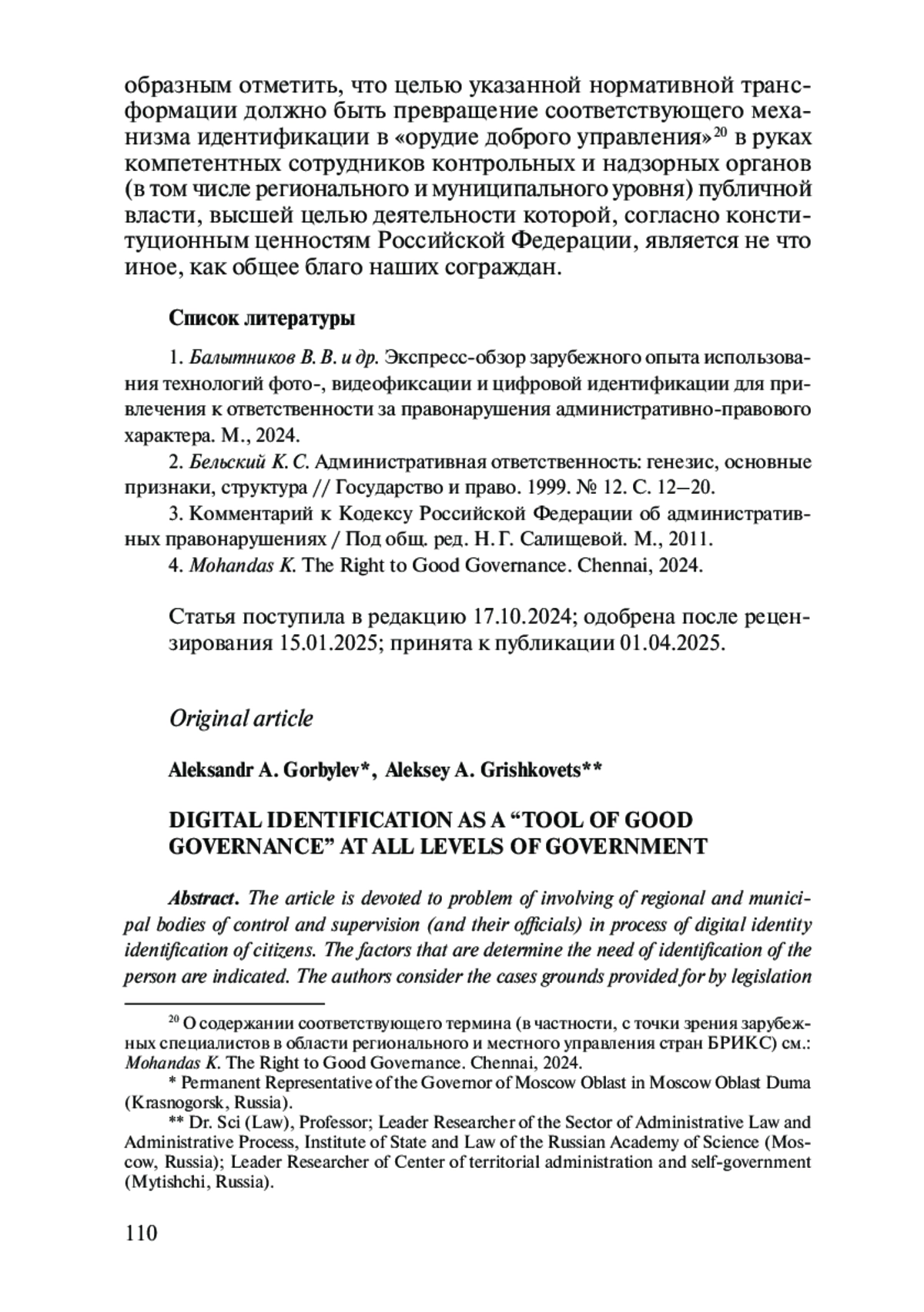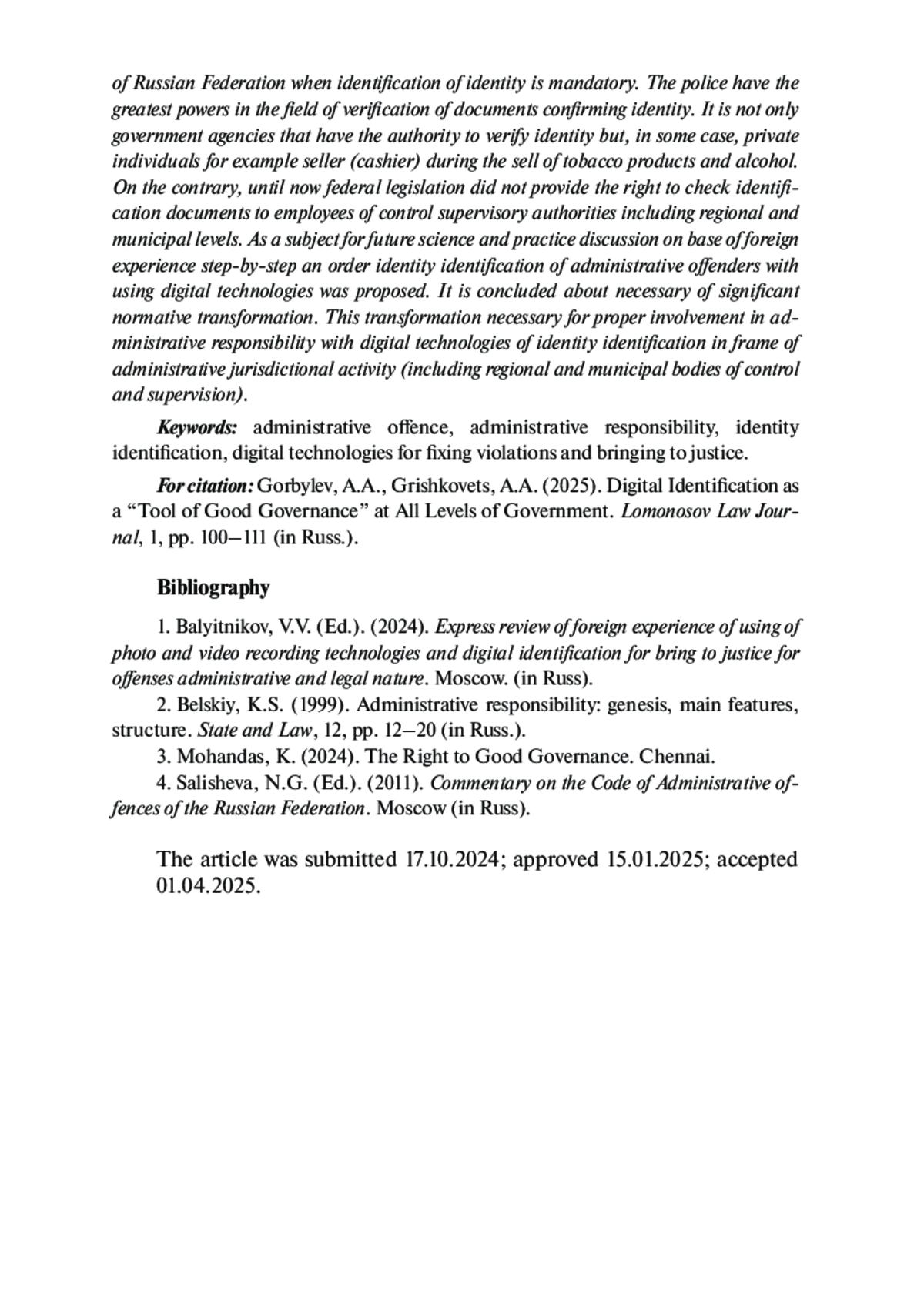 1. Балытников В. В. и др. Экспресс-обзор зарубежного опыта использования технологий фото-, видеофиксации и цифровой идентификации для привлечения к ответственности за правонарушения административно-правового характера. М., 2024.