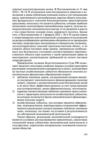 Статья посвящена комплексному анализу принципа солидарности как системообразующей категории, формализованной в Конституции Российской Федерации в 2020 г. Автор обосновывает тезис о том, что солидарность является не просто дополнением, а идейно-ценностным ядром и регулирующим принципом современного российского конституционализма. Она представляет собой понятие-парадигму и концептогенную стратегию, отражающую эволюцию конституционного мировоззрения в ответ на соответствующие исторические вызовы. Солидарность трактуется не как ограничение свободы, а как сущностная взаимообусловленность свободы индивида и общего блага, основанная на национальной идентичности и социокультурной традиции. Автор подчеркивает ее роль как метаценности, интегрирующей комплекс социальных идей Конституции Российской Федерации и позволяющей снимать коллизии между конституционными ценностями. Анализируется соотношение экономической, политической и социальной солидарности, которые раскрываются не как составные части, а как функциональные проявления единого принципа, где экономическая составляющая является фактически исходной, формирует материально-имущественный базис для последующей социальной реализации через существующие политические механизмы. Уделяя особое внимание экономической составляющей солидарности, автор определяет ее как ценностный ориентир, основу партнерства власти, бизнеса, производителей и потребителей, баланса частных и публичных интересов; предлагает новаторскую трактовку собственности как овеществленной солидарности; опираясь на практику отечественного конституционного правосудия, формулирует критерии правомерного возложения дополнительных обременений на частные хозяйствующие субъекты.