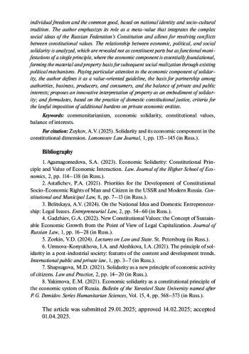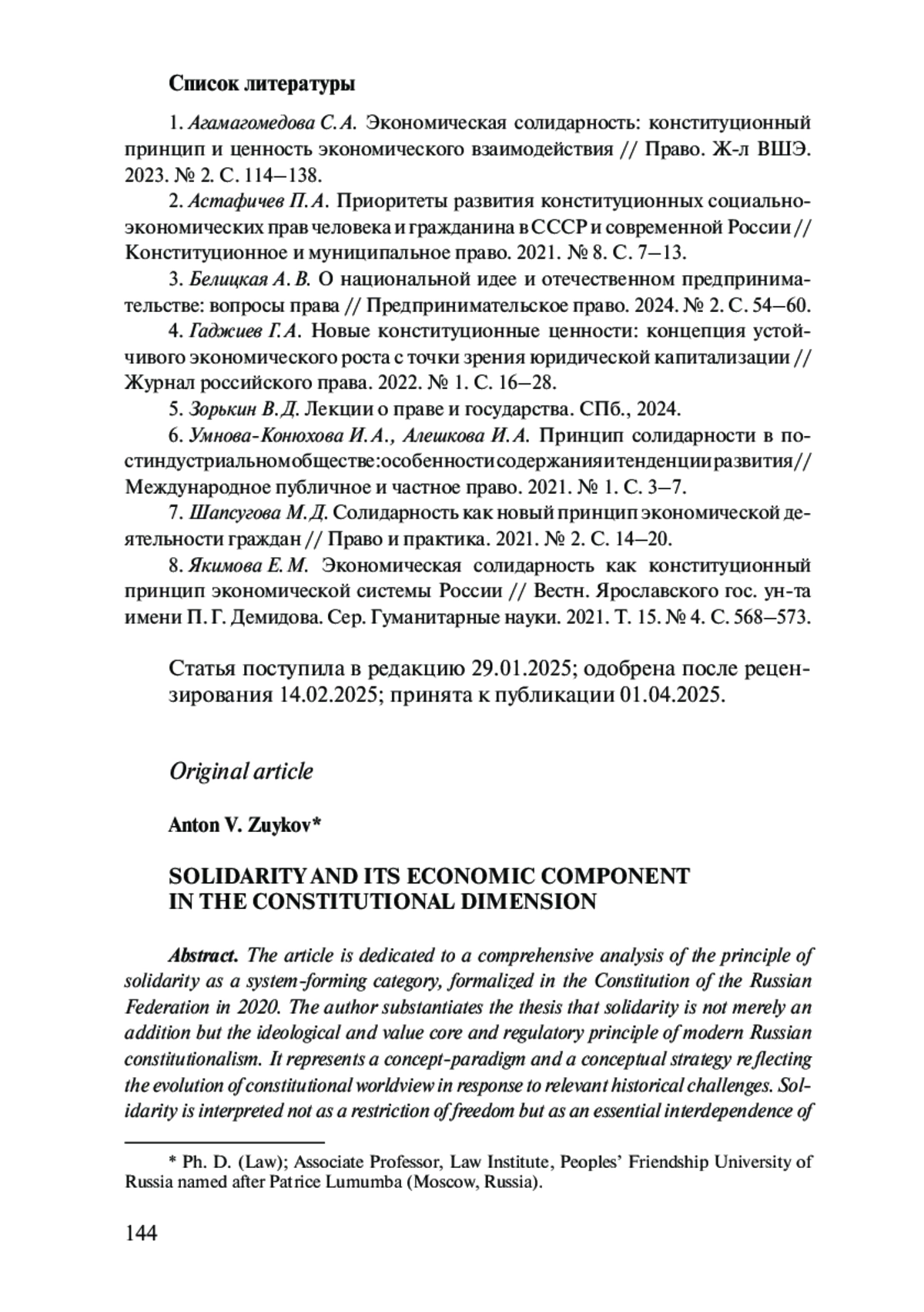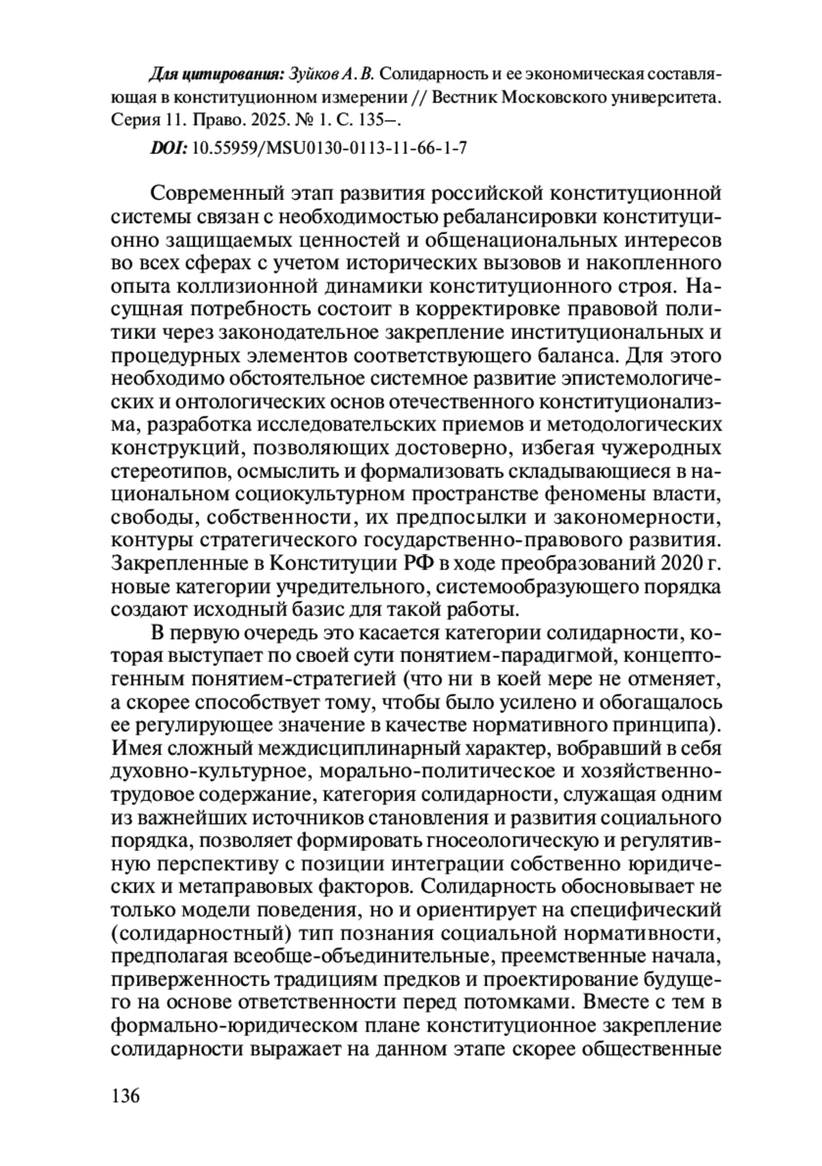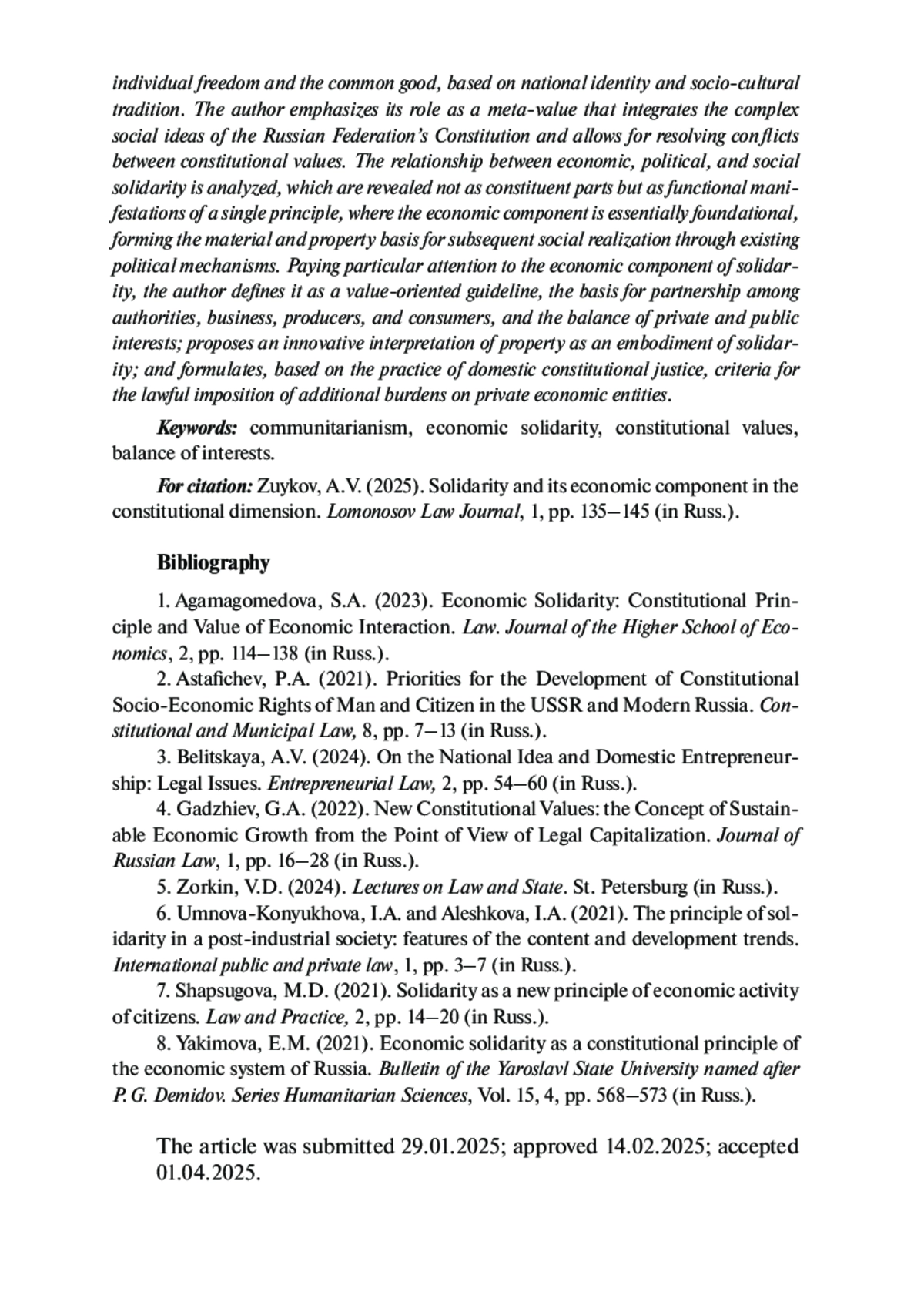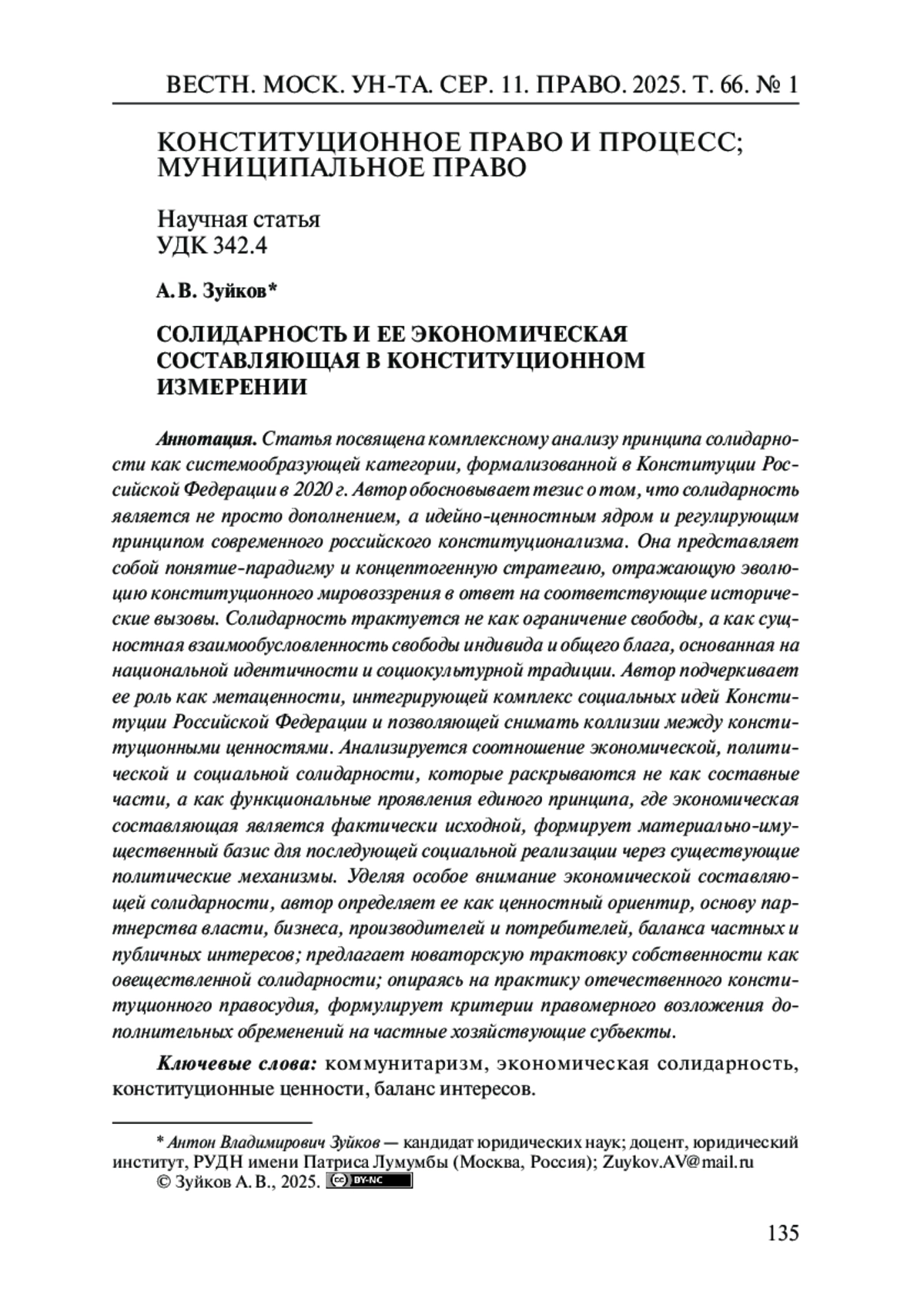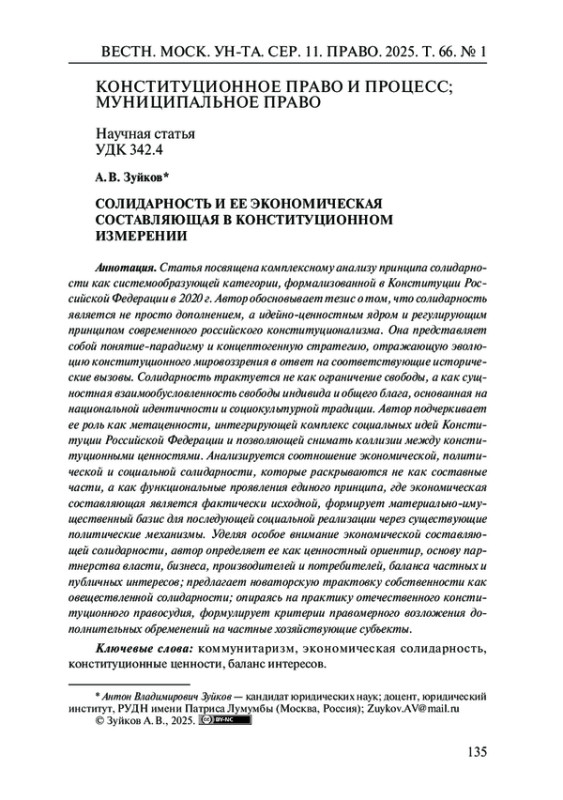 ЗУЙКОВ А. В. СОЛИДАРНОСТЬ И ЕЕ ЭКОНОМИЧЕСКАЯ СОСТАВЛЯЮЩАЯ В КОНСТИТУЦИОННОМ ИЗМЕРЕНИИ // ВЕСТНИК МОСКОВСКОГО УНИВЕРСИТЕТА. СЕРИЯ 11: ПРАВО. 2025. № 1