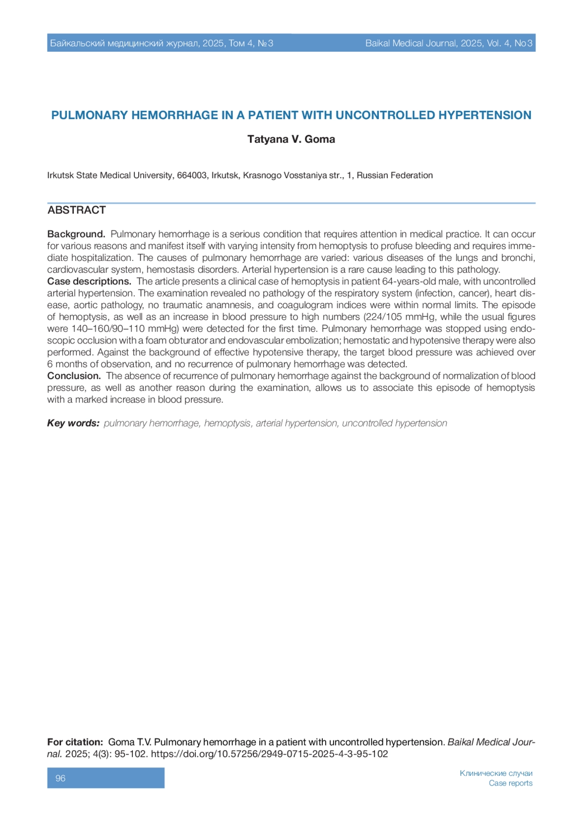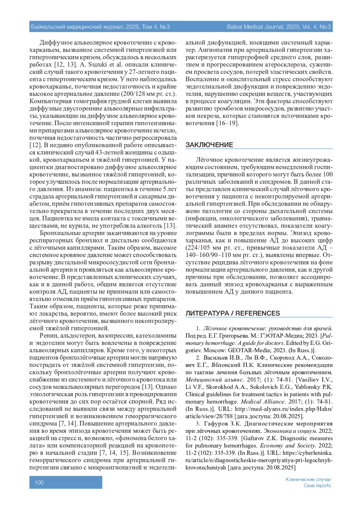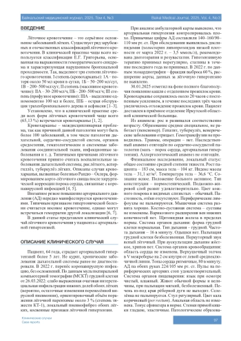 ГОМА Т.В. ЛЁГОЧНОЕ КРОВОТЕЧЕНИЕ У ПАЦИЕНТА С НЕКОНТРОЛИРУЕМОЙ АРТЕРИАЛЬНОЙ ГИПЕРТЕНЗИЕЙ // БАЙКАЛЬСКИЙ МЕДИЦИНСКИЙ ЖУРНАЛ. 2025. № 3, ТОМ 4
