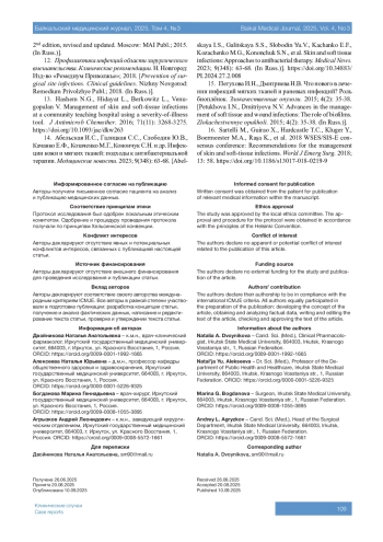 14. Абельская И.С., Галицкая С.С., Слободин Ю.В. и др. Инфекции кожи и мягких тканей: подходы к антибактериальной терапии. Медицинские новости. 2023;9(348):63-68. DOI: 10.34883/PI.2024.27.2.008