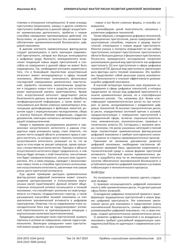 В научной литературе получили свое отражения исследования в сфере цифровых технологий, в которых представлен не только вид цифровой преступности и анализ криминогенных рисков, но и классификация названных рисков. Так, например, Д. А. Конев классифицирует криминологические риски на три категории: а) риски, ассоциированные с внедрением цифровых технологий; б) высокие технологические риски; в) риски, определяемые системой причин и условий, предрасполагающих к совершению преступлений в определенной сфере, включая социально-политические, экономические, психологические, правовые и технические аспекты [5]. Соглашаясь с мнением автора, полагаем, что риски указанных категорий в полной мере соответствуют криминогенным фактор-рискам цифровой экономики и требуют всестороннего анализа и оценки со стороны правоохранительных органов.