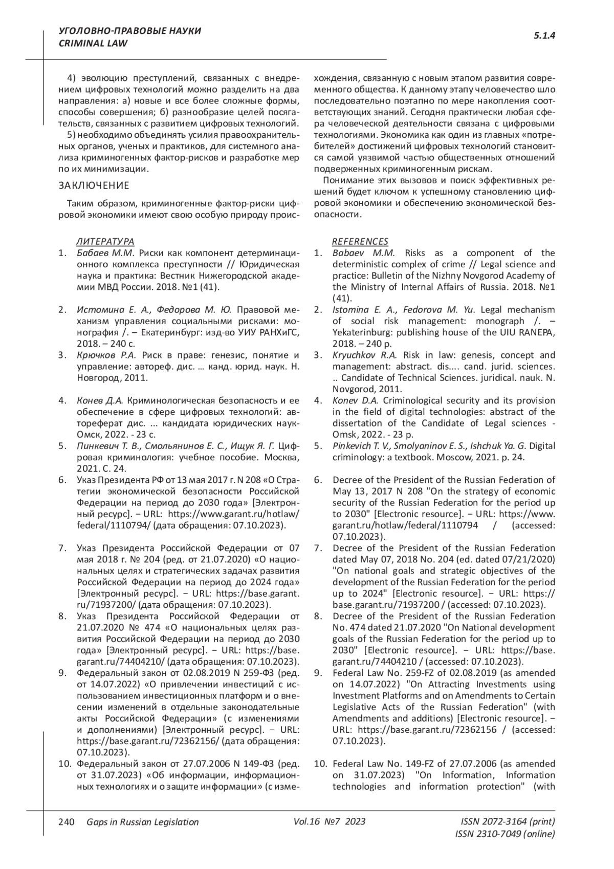 1. 	Бабаев М.М. Риски как компонент детерминационного комплекса преступности // Юридическая наука и практика: Вестник Нижегородской академии МВД России. 2018. №1 (41).