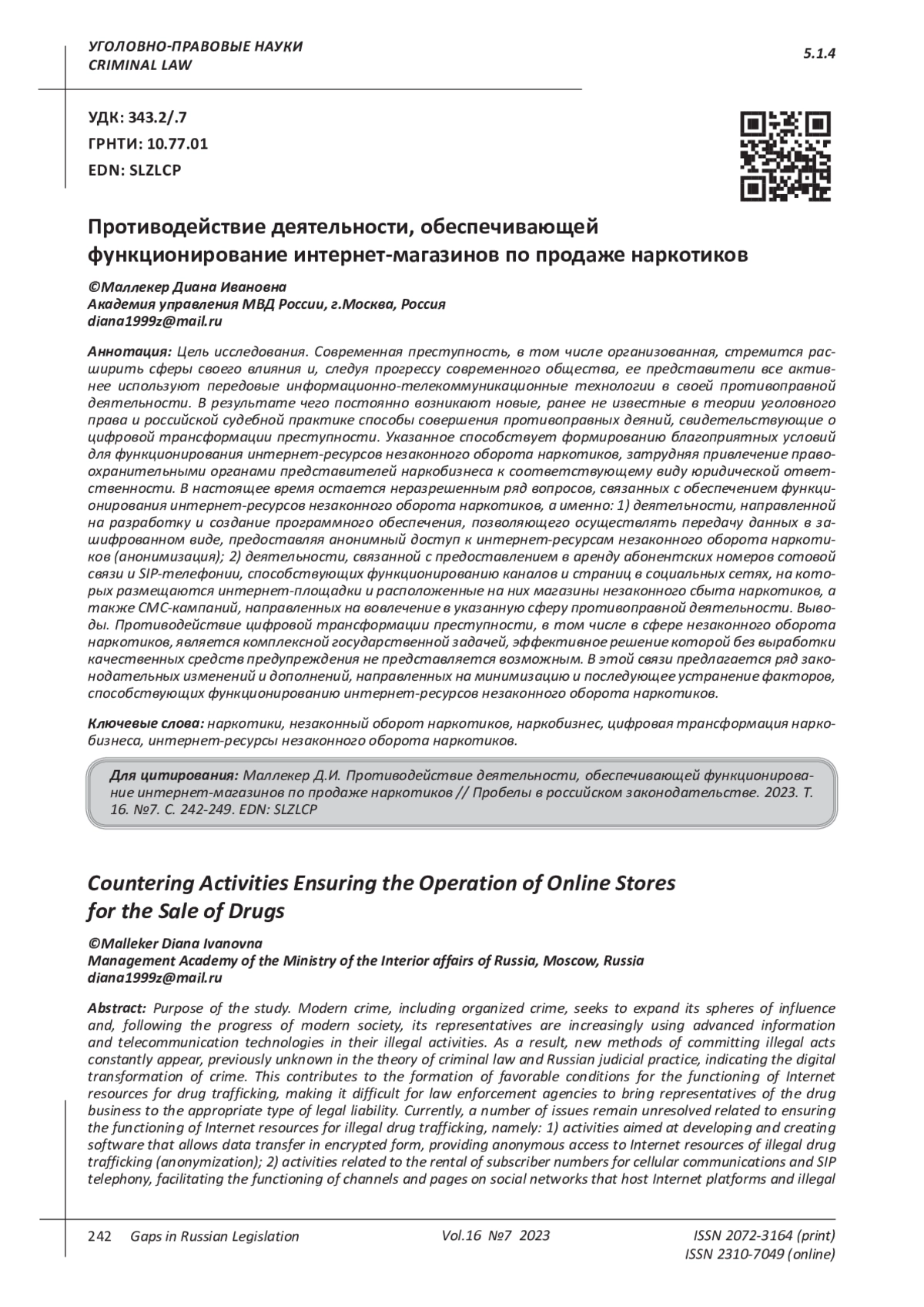 МАЛЛЕКЕР Д. И. ПРОТИВОДЕЙСТВИЕ ДЕЯТЕЛЬНОСТИ, ОБЕСПЕЧИВАЮЩЕЙ ФУНКЦИОНИРОВАНИЕ ИНТЕРНЕТ-МАГАЗИНОВ ПО ПРОДАЖЕ НАРКОТИКОВ // ПРОБЕЛЫ В РОССИЙСКОМ ЗАКОНОДАТЕЛЬСТВЕ. 2023. Т. 16 № 7 (42 СТ.)