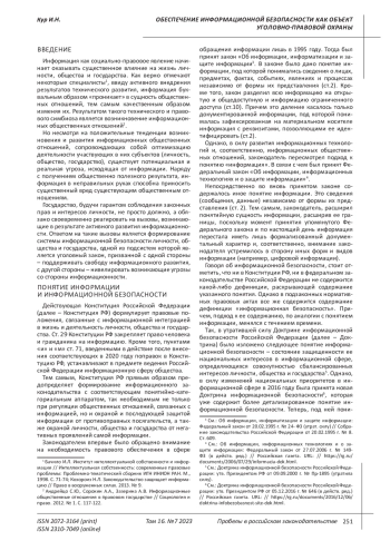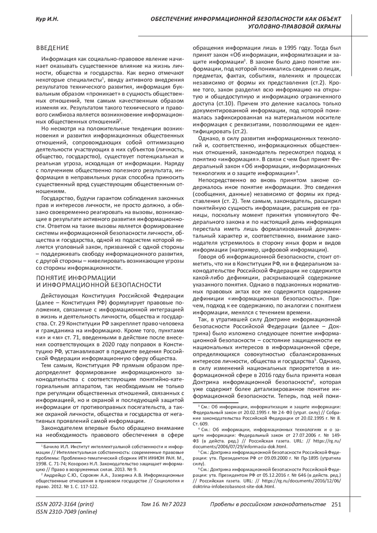 Непосредственно во вновь принятом законе содержалось иное понятие информации. Это сведения (сообщения, данные) независимо от формы их представления (ст. 2). Тем самым, законодатель, расширил понятийную сущность информации, расширив ее границы, поскольку момент принятия упомянутого Федерального закона и по настоящий день информация перестала иметь лишь формализованный документальный характер и, соответственно, внимание законодателя устремилось в сторону иных форм и видов информации (например, цифровой информации). Говоря об информационной безопасности, стоит отметить, что ни в Конституции РФ, ни в федеральном законодательстве Российской Федерации не содержится какой-либо дефиниции, раскрывающей содержание указанного понятия. Однако в подзаконных нормативных правовых актах все же содержится содержание дефиниции «информационная безопасность». Причем, подход к ее содержанию, по аналогии с понятием информации, менялся с течением времени.
