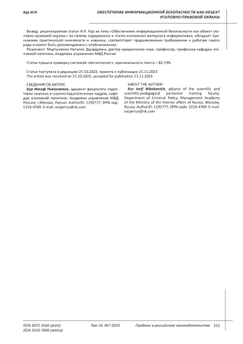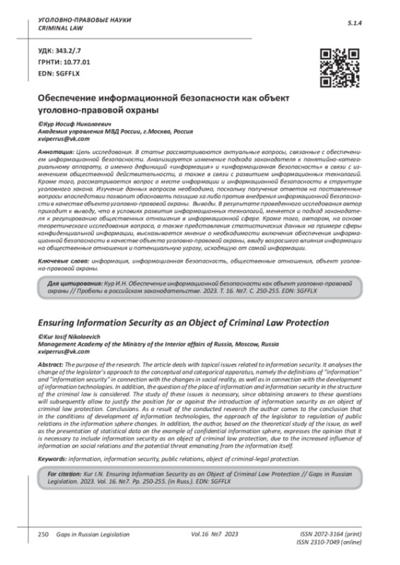 Цель исследования. В статье рассматриваются актуальные вопросы, связанные с обеспечением информационной безопасности. Анализируется изменение подхода законодателя к понятийно-категориальному аппарату, а именно дефиниций «информация» и «информационная безопасность» в связи с изменением общественной действительности, а также в связи с развитием информационных технологий. Кроме того, рассматривается вопрос о месте информации и информационной безопасности в структуре уголовного закона. Изучение данных вопросов необходимо, поскольку получение ответов на поставленные вопросы впоследствии позволит обосновать позицию за либо против внедрения информационной безопасности в качестве объекта уголовно-правовой охраны. Выводы. В результате проведенного исследования автор приходит к выводу, что в условиях развития информационных технологий, меняется и подход законодателя к регулированию общественных отношения в информационной сфере. Кроме того, автором, на основе теоретического исследования вопроса, а также представления статистических данных на примере сферы конфиденциальной информации, высказывается мнение о необходимости включения обеспечения информационной безопасности в качестве объекта уголовно-правовой охраны, ввиду возросшего влияния информации на общественные отношения и потенциальную угрозу, исходящую от самой информации.