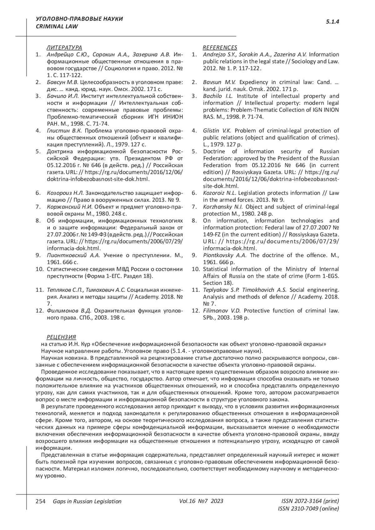 6. 	Козороиз Н.Л. Законодательство защищает информацию // Право в вооруженных силах. 2013. № 9.