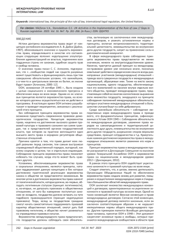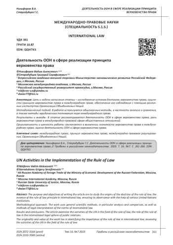 Цель и задачи написания статьи - исследование истоков доктрины верховенства права, сущности принципа верховенства права в международном праве, обеспечение его соблюдения с помощью различных институтов Организации Объединенных Наций. Методологический подход. В работе используются общенаучные методы, в частности анализа и сравнения, а также методы юридического толкования норм международного права. Результаты и выводы. В статье рассматривается деятельность ООН в сфере верховенства права, роль верховенства права в международно-правовой сфере общественных отношений. Оригинальность и ценность работы заключается в выявлении значимости верховенства права в международном праве, оценке деятельности ООН в сфере верховенства права.
