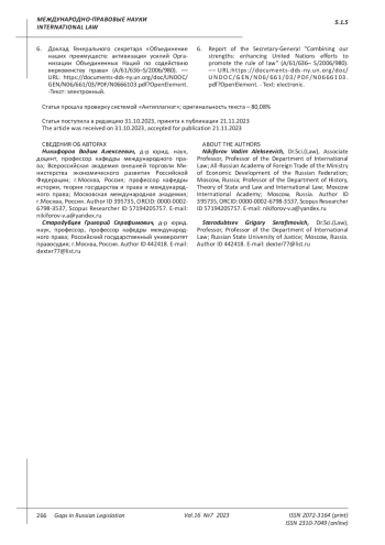 6. 	Доклад Генерального секретаря “Объединение наших преимуществ: активизация усилий Организации Объединенных Наций по содействию верховенству права” (A/61/636-S/2006/980). - URL: https://documents-dds-ny.un.org/doc/UNDOC/GEN/N06/661/03/PDF/N0666103.pdf?OpenElement. -Текст: электронный.
