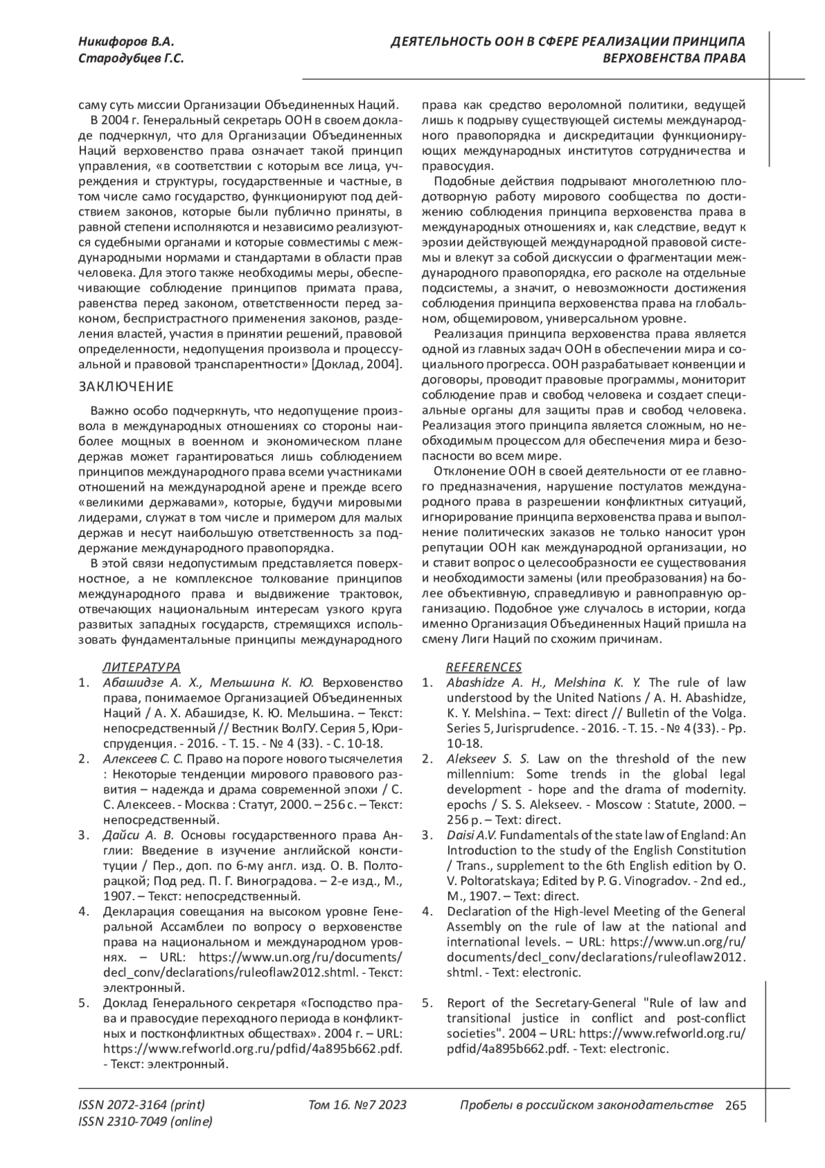 1. 	Абашидзе А. Х., Мельшина К. Ю. Верховенство права, понимаемое Организацией Объединенных Наций / А. Х. Абашидзе, К. Ю. Мельшина. - Текст: непосредственный // Вестник ВолГУ. Серия 5, Юриспруденция. - 2016. - Т. 15. - № 4 (33). - С. 10-18.