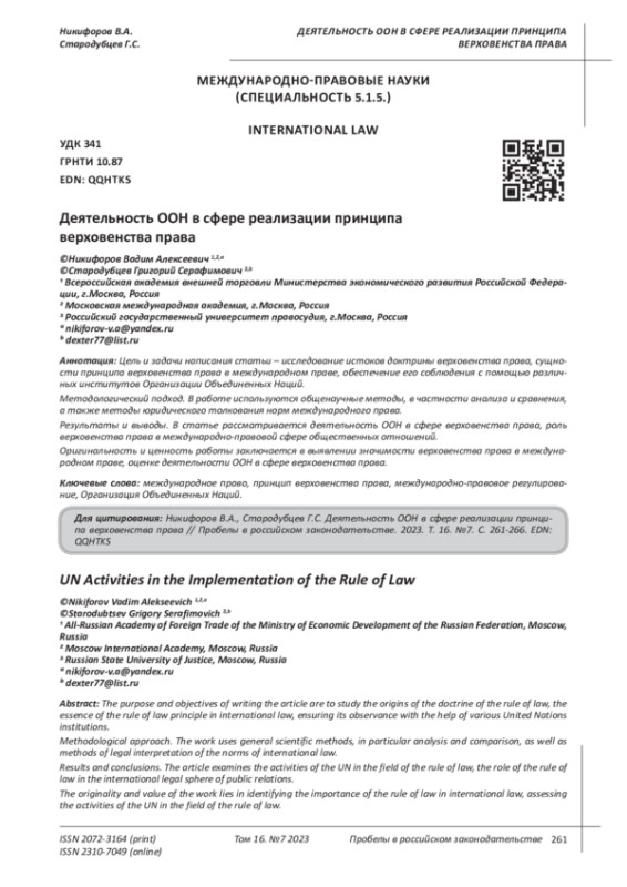 Abashidze A. H., Melshina K. Y. The rule of law understood by the United Nations / A. H. Abashidze, K. Y. Melshina. - Text: direct // Bulletin of the Volga. Series 5, Jurisprudence. - 2016. - T. 15. - № 4 (33). - Pp. 10-18.