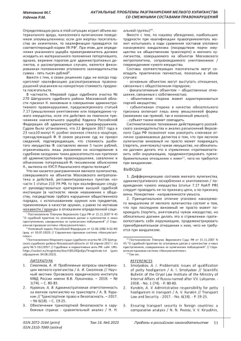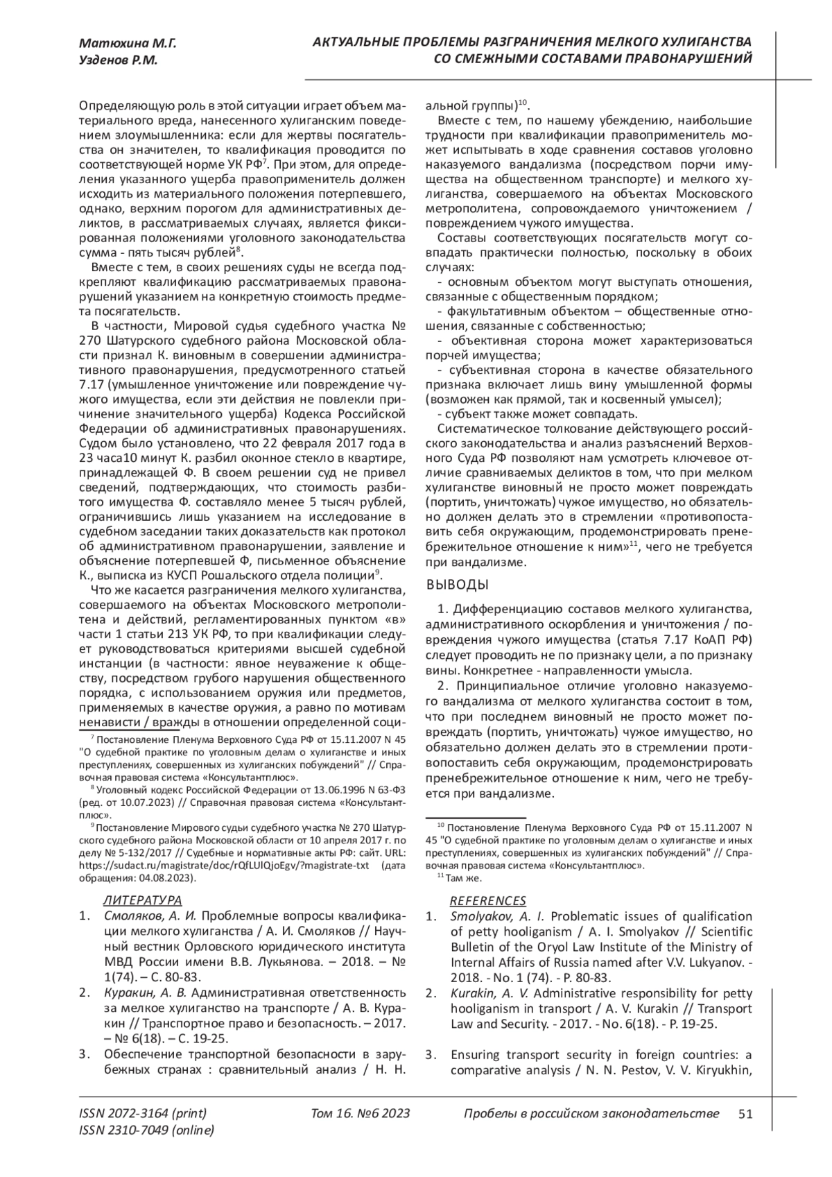2. 	Куракин, А. В. Административная ответственность за мелкое хулиганство на транспорте / А. В. Куракин // Транспортное право и безопасность. - 2017. - № 6(18). - С. 19-25. EDN: ZGBJML