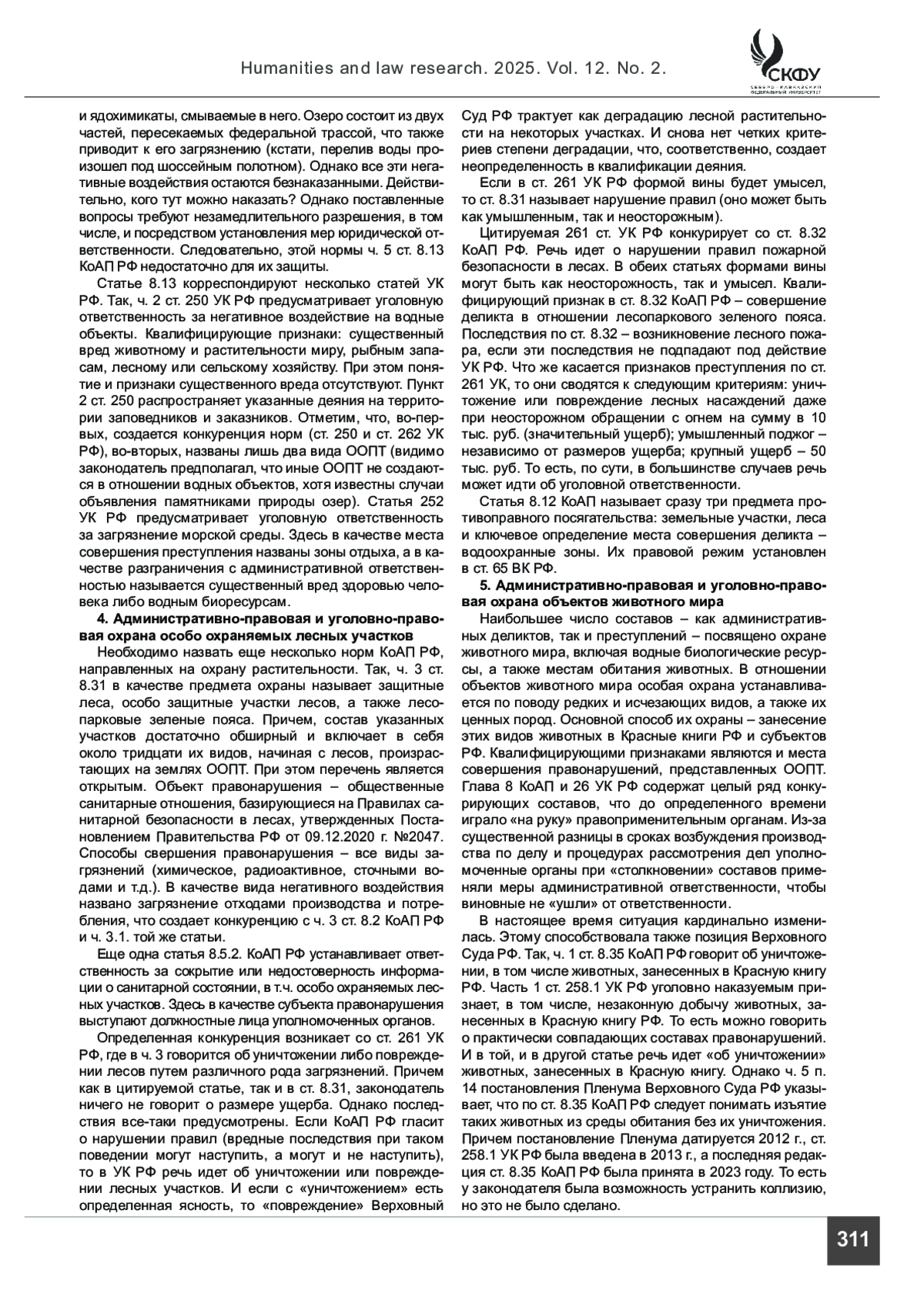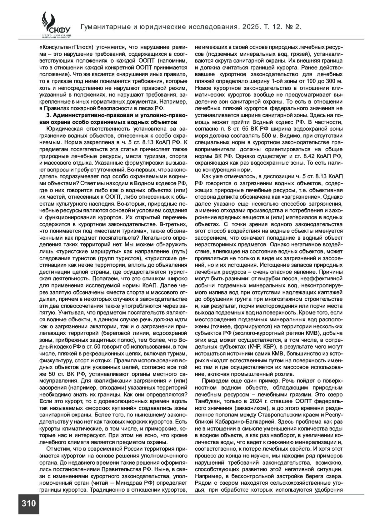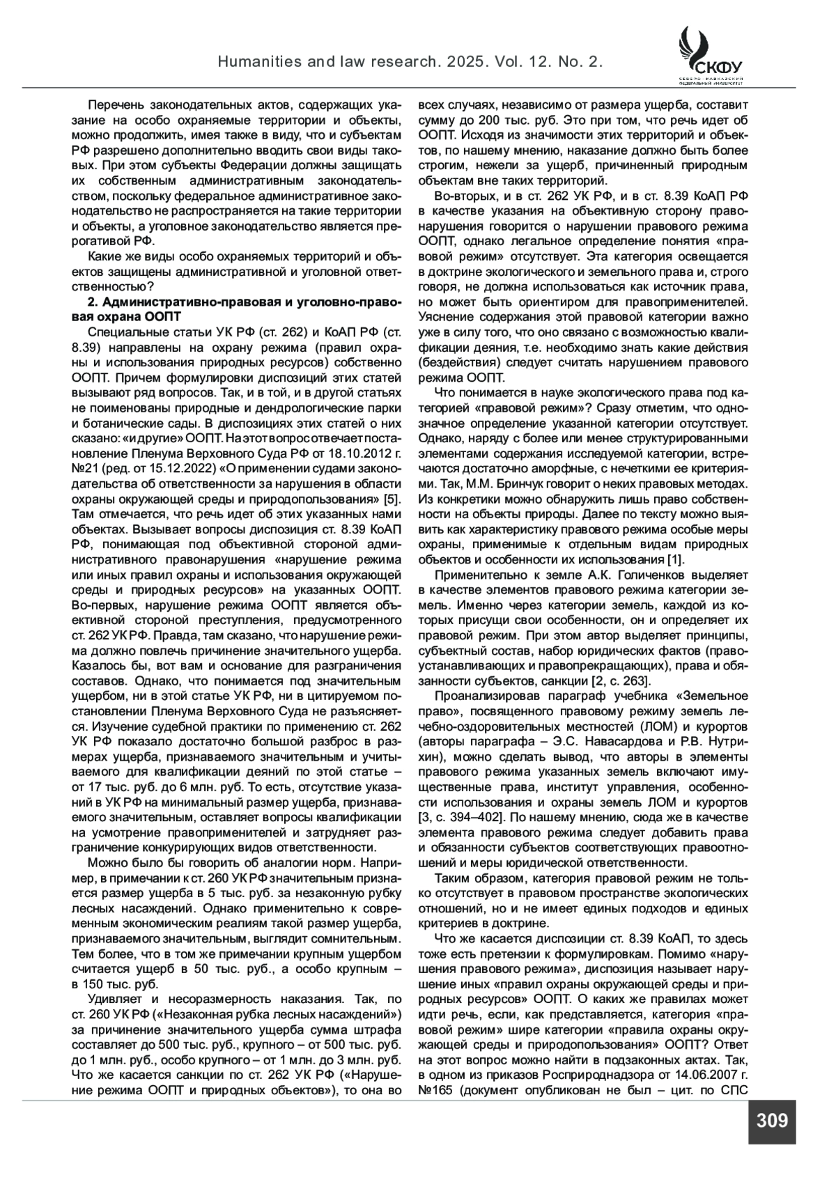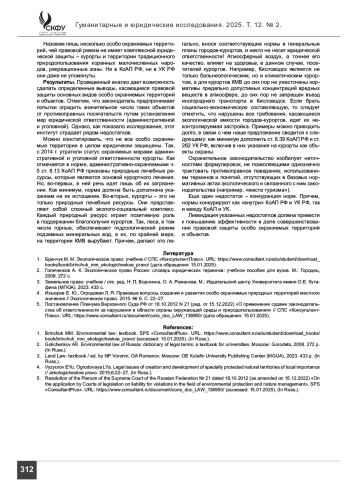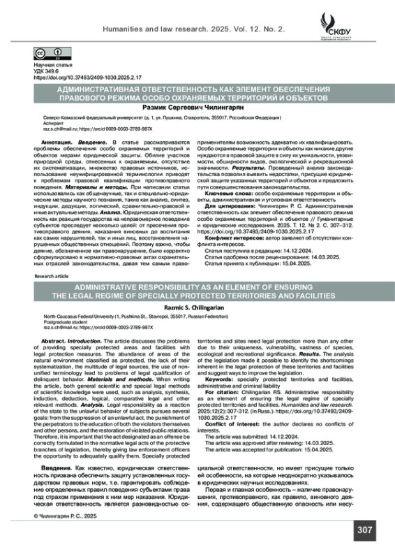 ЧИЛИНГАРЯН Р. С. АДМИНИСТРАТИВНАЯ ОТВЕТСТВЕННОСТЬ КАК ЭЛЕМЕНТ ОБЕСПЕЧЕНИЯ ПРАВОВОГО РЕЖИМА ОСОБО ОХРАНЯЕМЫХ ТЕРРИТОРИЙ И ОБЪЕКТОВ // ГУМАНИТАРНЫЕ И ЮРИДИЧЕСКИЕ ИССЛЕДОВАНИЯ. 2025. ТОМ 12, № 2