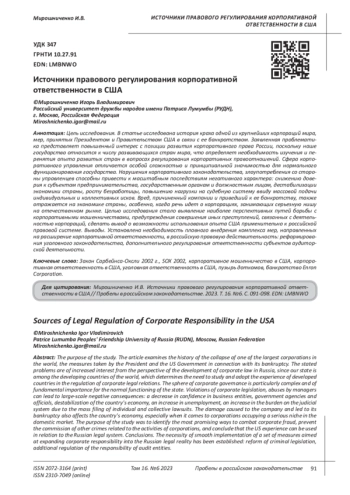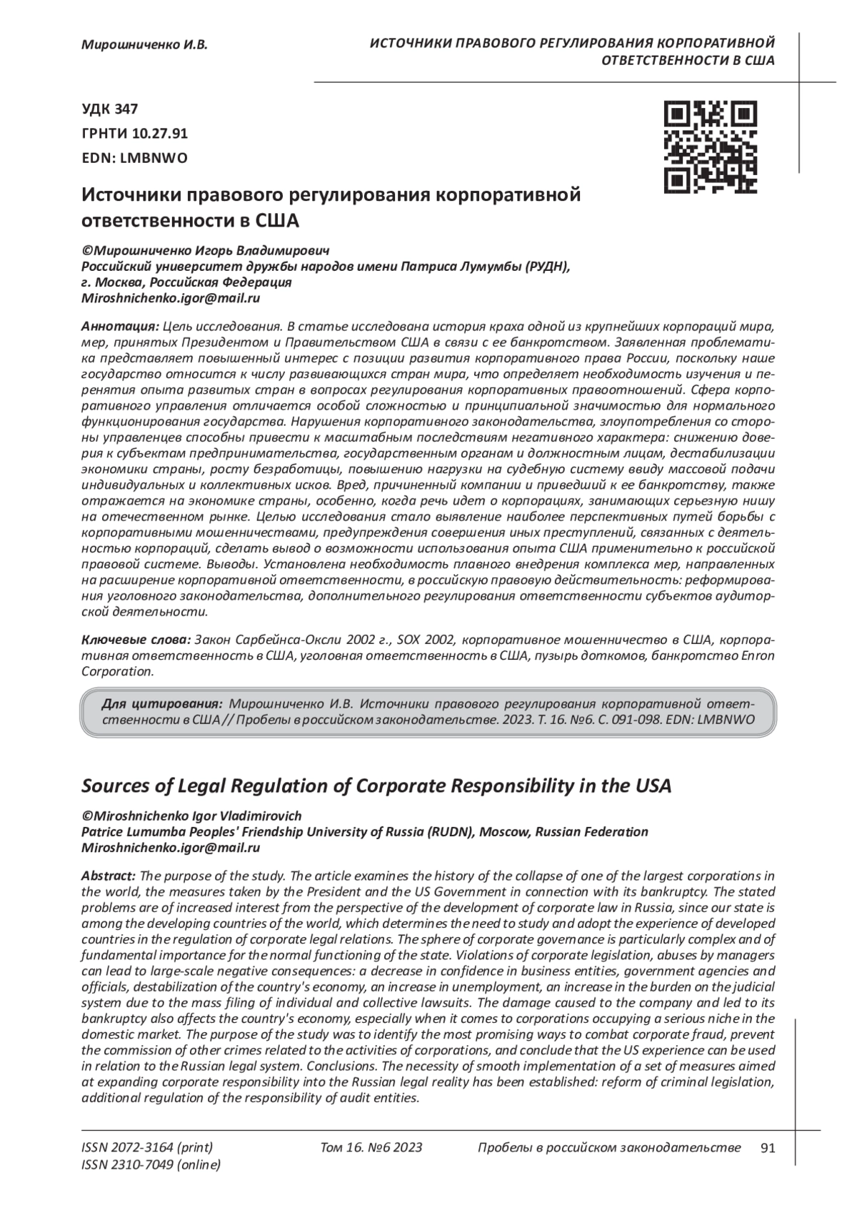 Цель исследования. В статье исследована история краха одной из крупнейших корпораций мира, мер, принятых Президентом и Правительством США в связи с ее банкротством. Заявленная проблематика представляет повышенный интерес с позиции развития корпоративного права России, поскольку наше государство относится к числу развивающихся стран мира, что определяет необходимость изучения и перенятия опыта развитых стран в вопросах регулирования корпоративных правоотношений. Сфера корпоративного управления отличается особой сложностью и принципиальной значимостью для нормального функционирования государства. Нарушения корпоративного законодательства, злоупотребления со стороны управленцев способны привести к масштабным последствиям негативного характера: снижению доверия к субъектам предпринимательства, государственным органам и должностным лицам, дестабилизации экономики страны, росту безработицы, повышению нагрузки на судебную систему ввиду массовой подачи индивидуальных и коллективных исков. Вред, причиненный компании и приведший к ее банкротству, также отражается на экономике страны, особенно, когда речь идет о корпорациях, занимающих серьезную нишу на отечественном рынке. Целью исследования стало выявление наиболее перспективных путей борьбы с корпоративными мошенничествами, предупреждения совершения иных преступлений, связанных с деятельностью корпораций, сделать вывод о возможности использования опыта США применительно к российской правовой системе. Выводы. Установлена необходимость плавного внедрения комплекса мер, направленных на расширение корпоративной ответственности, в российскую правовую действительность: реформирования уголовного законодательства, дополнительного регулирования ответственности субъектов аудиторской деятельности.