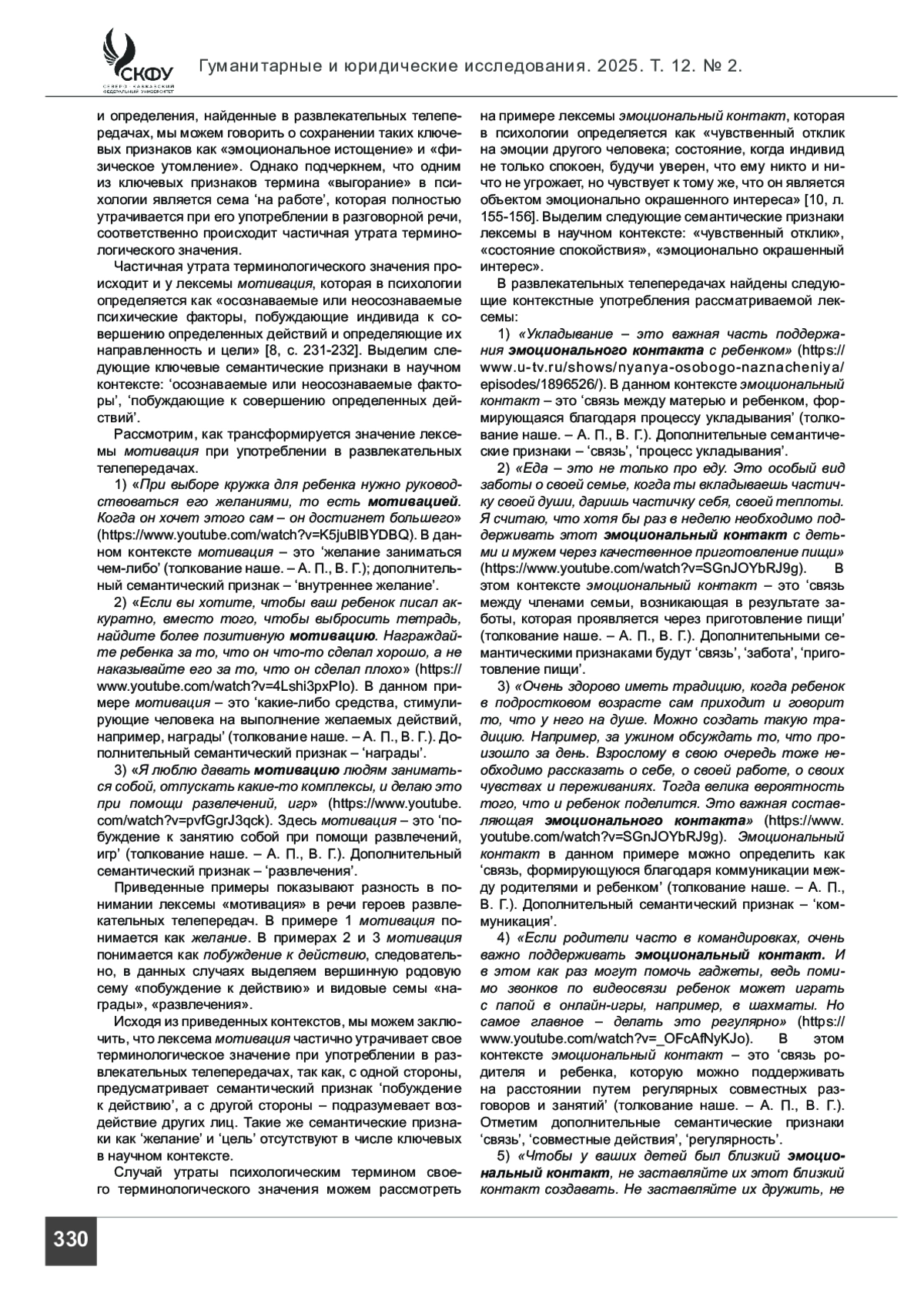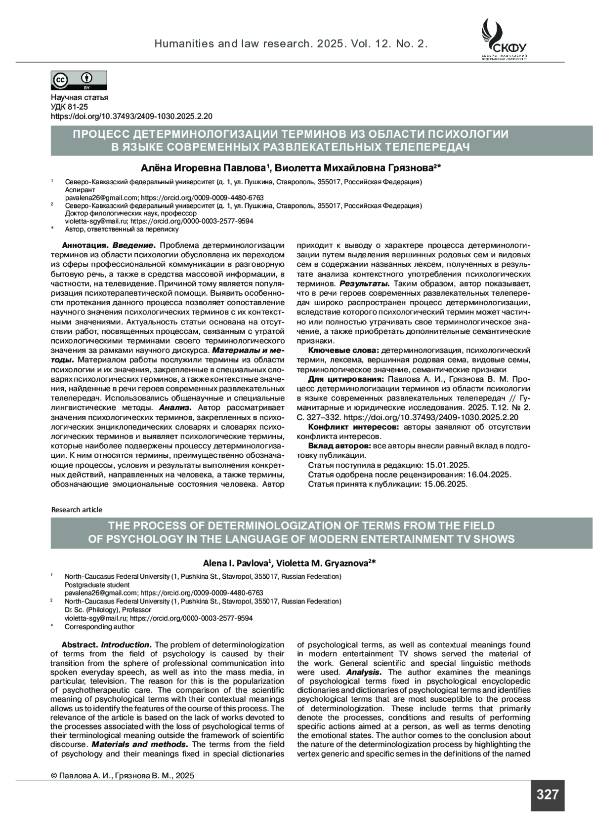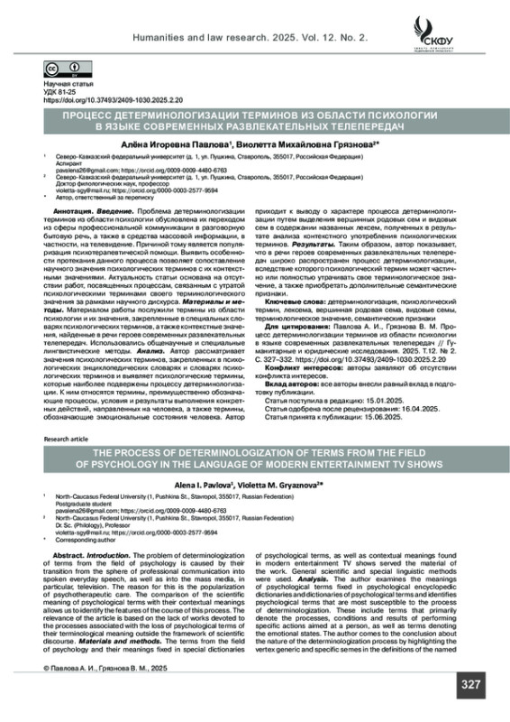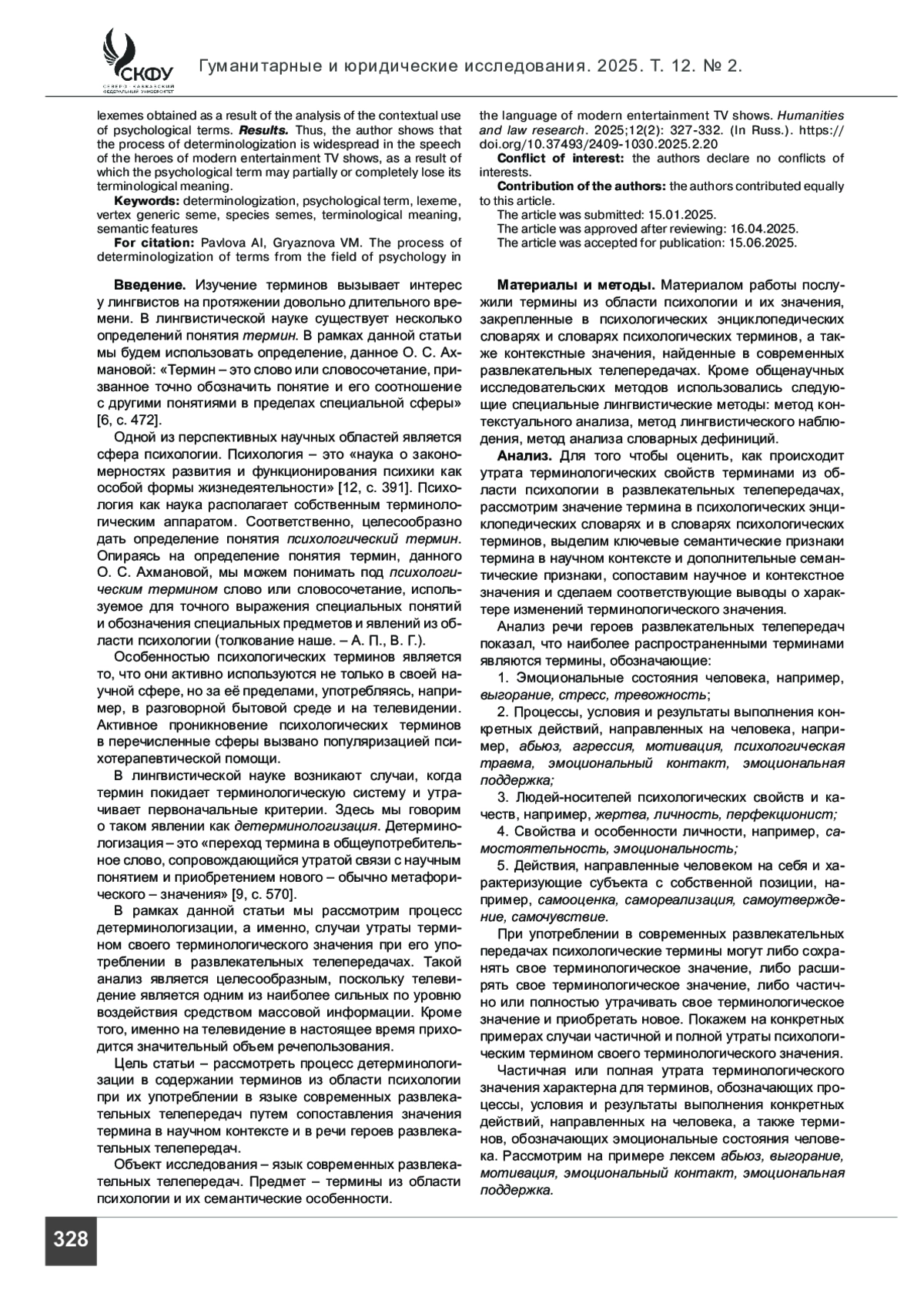 ПАВЛОВА А. И., ГРЯЗНОВА В. М. ПРОЦЕСС ДЕТЕРМИНОЛОГИЗАЦИИ ТЕРМИНОВ ИЗ ОБЛАСТИ ПСИХОЛОГИИ В ЯЗЫКЕ СОВРЕМЕННЫХ РАЗВЛЕКАТЕЛЬНЫХ ТЕЛЕПЕРЕДАЧ // ГУМАНИТАРНЫЕ И ЮРИДИЧЕСКИЕ ИССЛЕДОВАНИЯ. 2025. ТОМ 12, № 2