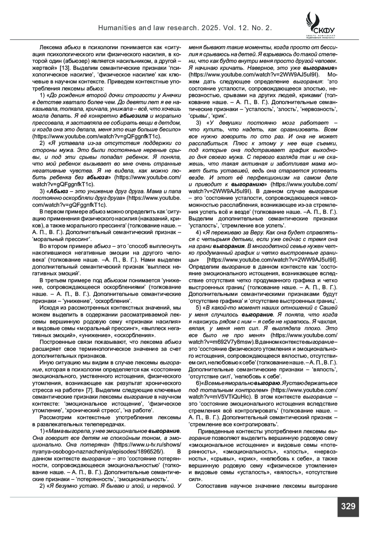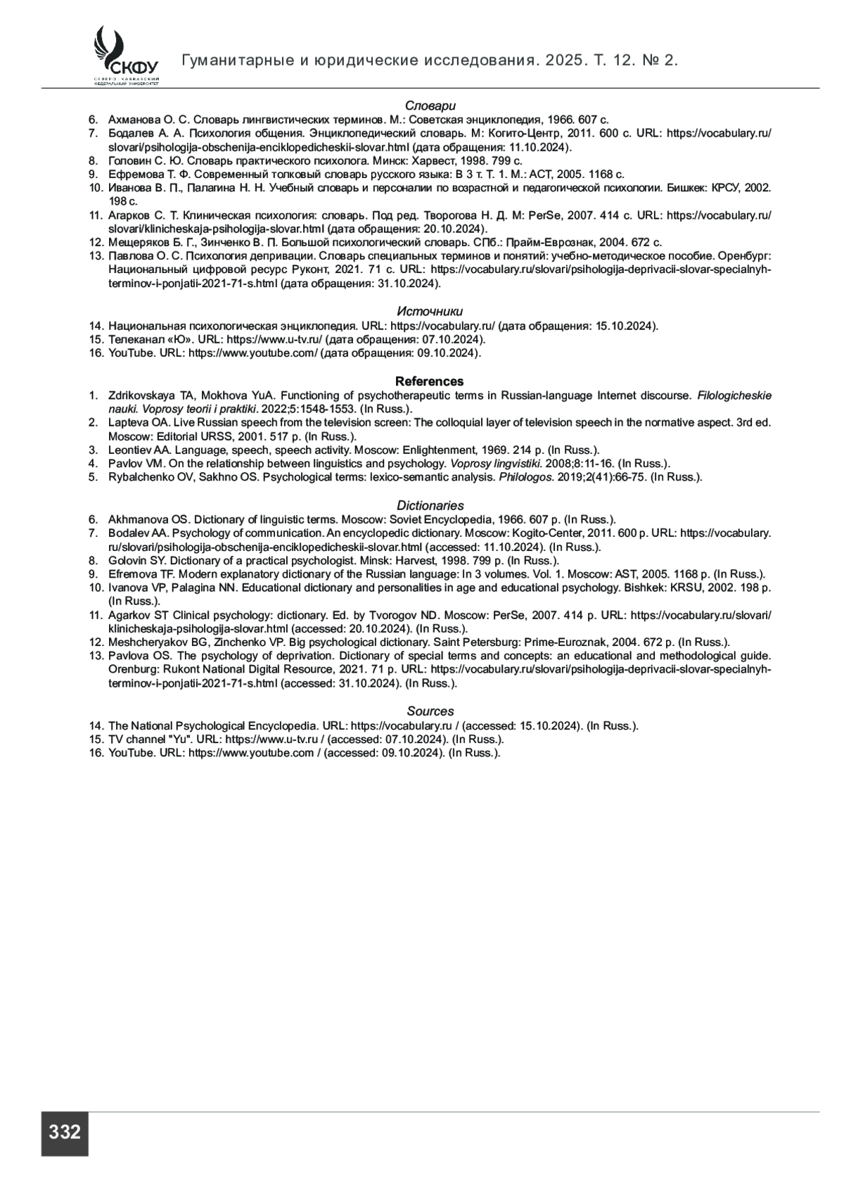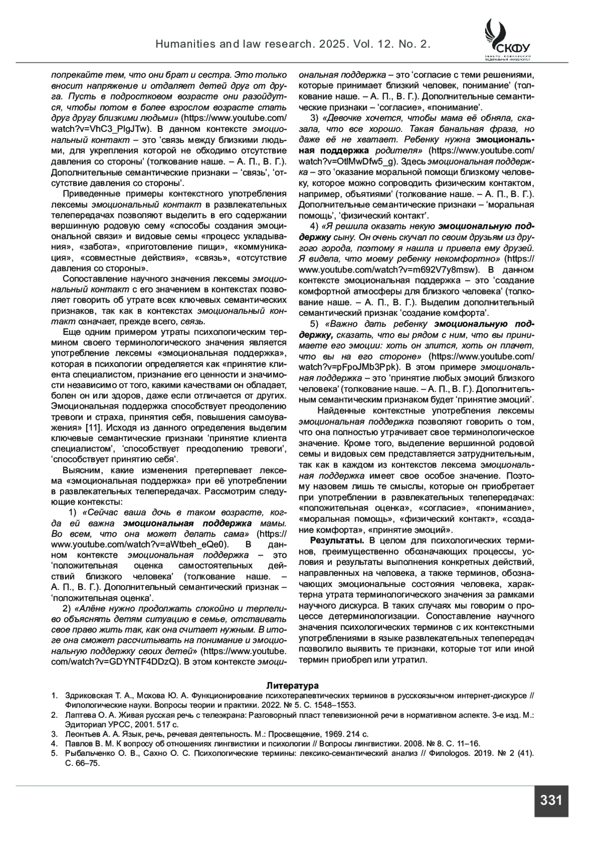 ПАВЛОВА А. И., ГРЯЗНОВА В. М. ПРОЦЕСС ДЕТЕРМИНОЛОГИЗАЦИИ ТЕРМИНОВ ИЗ ОБЛАСТИ ПСИХОЛОГИИ В ЯЗЫКЕ СОВРЕМЕННЫХ РАЗВЛЕКАТЕЛЬНЫХ ТЕЛЕПЕРЕДАЧ // ГУМАНИТАРНЫЕ И ЮРИДИЧЕСКИЕ ИССЛЕДОВАНИЯ. 2025. ТОМ 12, № 2