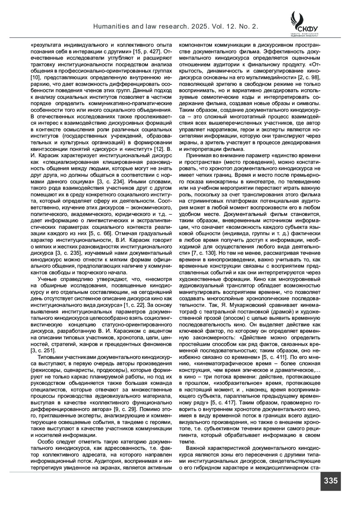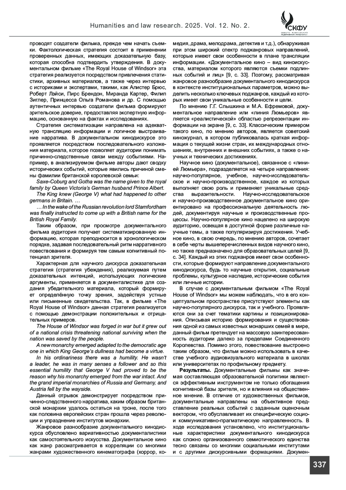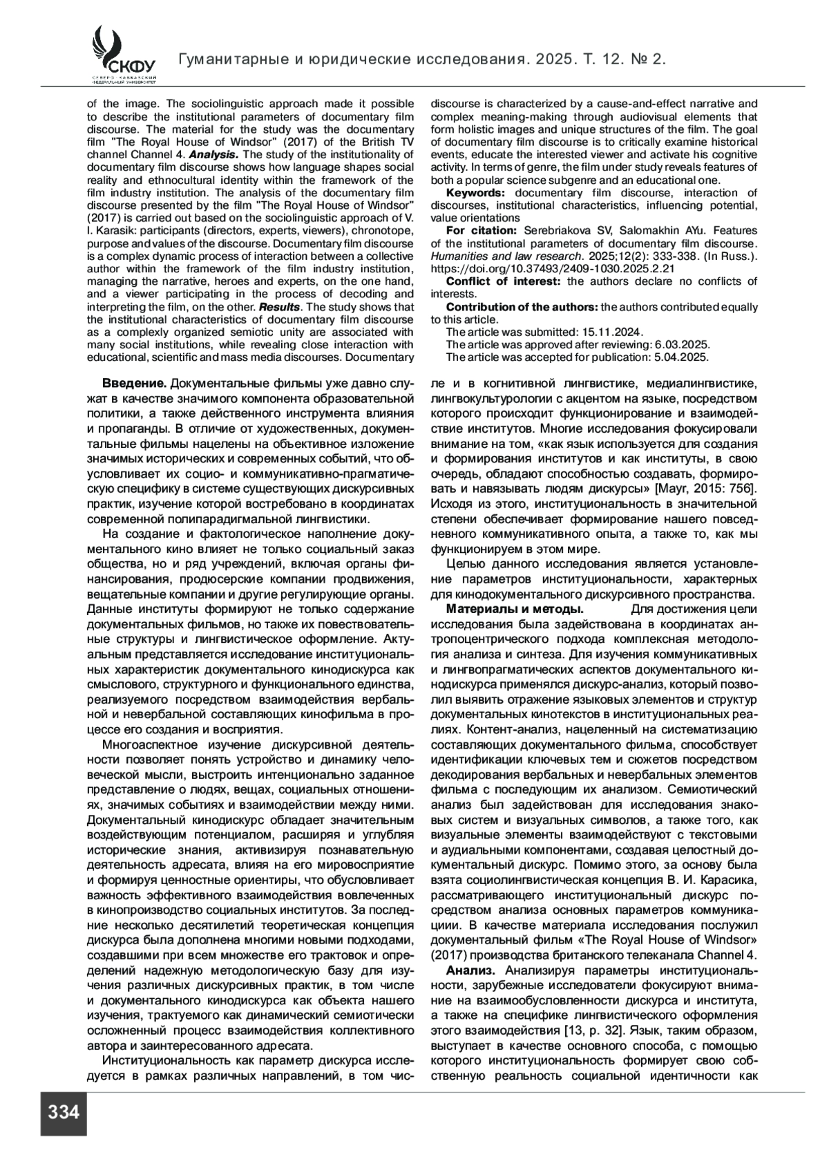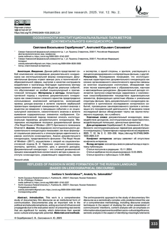 СЕРЕБРЯКОВА С. В., САЛОМАХИН А. Ю. ОСОБЕННОСТИ ИНСТИТУЦИОНАЛЬНАЛЬНЫХ ПАРАМЕТРОВ ДОКУМЕНТАЛЬНОГО КИНОДИСКУРСА // ГУМАНИТАРНЫЕ И ЮРИДИЧЕСКИЕ ИССЛЕДОВАНИЯ. 2025. ТОМ 12, № 2