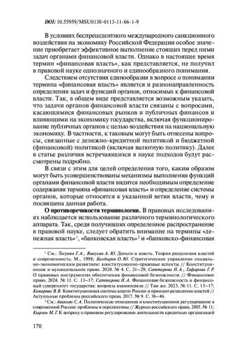 В условиях беспрецедентного международного санкционного воздействия на экономику Российской Федерации особое значение приобретает эффективное выполнение стоящих перед ними задач органами финансовой власти. Однако в настоящее время термин «финансовая власть», как представляется, не получил в правовой науке однозначного и единообразного понимания.