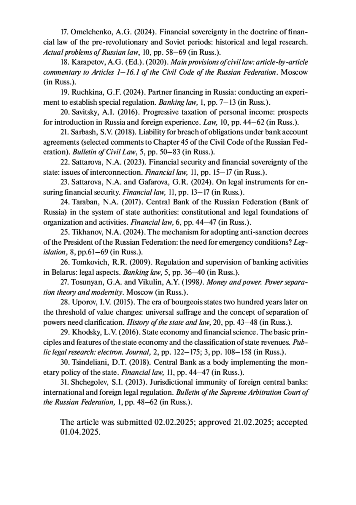 22. Саттарова Н. А. Финансовая безопасность и финансовый суверенитет государства: вопросы взаимосвязи // Финансовое право. 2023. № 11. С. 15-17. EDN: MOWVAX
