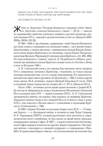 Житие св. Августина» Поссидия Каламского открывает собой «Книгу св. Августина, епископа Гиппонского» (далее — КСА) — никогда не издававшийся памятник латинского влияния в русской литературе первой половины XVI в., важный и ценный источник (о ней см.: [Калугин 2002; 2003a; 2003b; 2013]).
