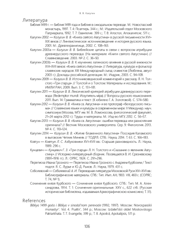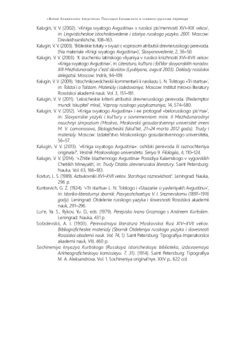 2. 	Калугин В. В. “Книга святого Августина” в русской письменности XVI- XIX веков // Лингвистическое источниковедение и история русского языка. 2001. М.: Древлехранилище, 2002. С. 108-163.