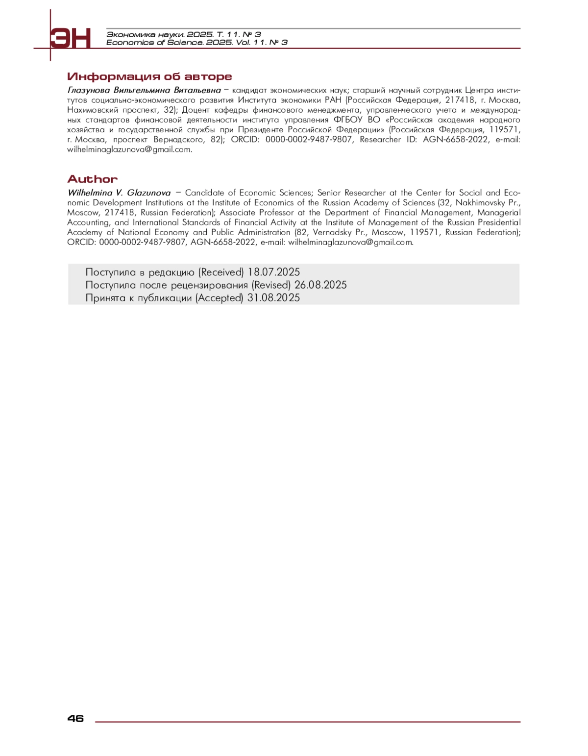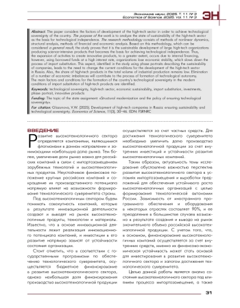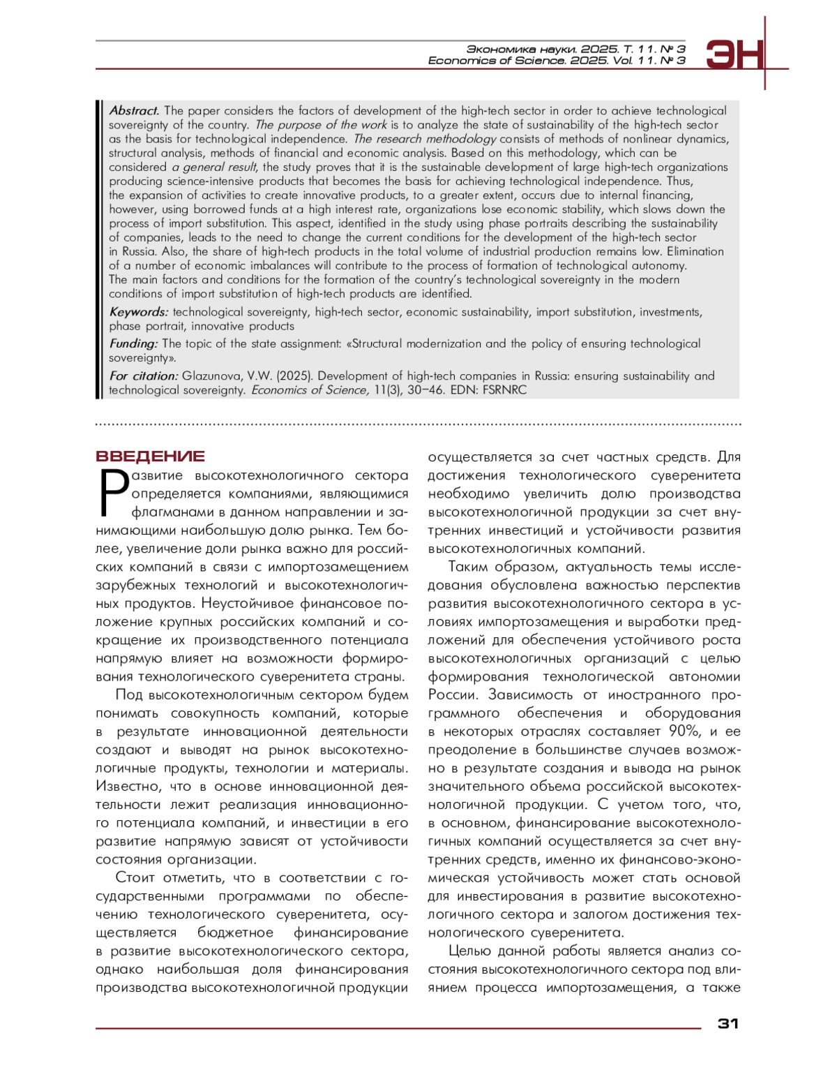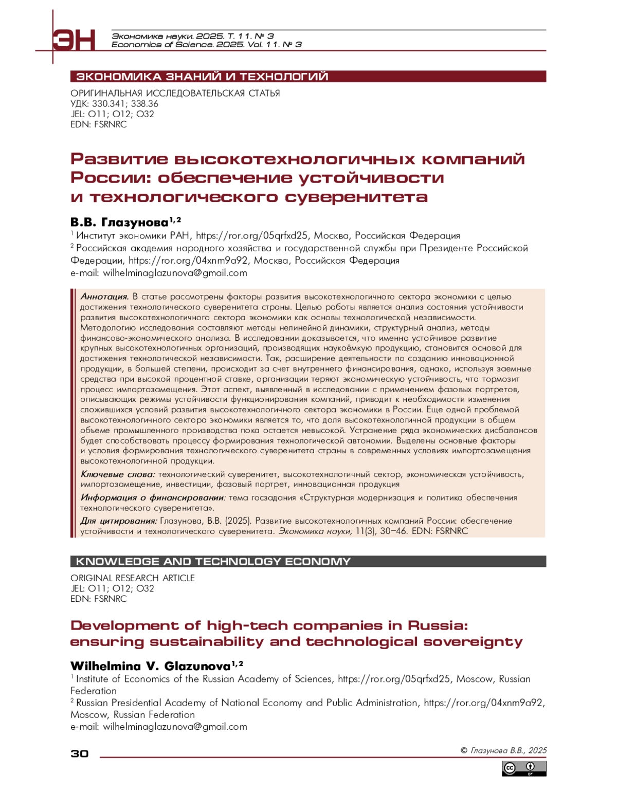 ГЛАЗУНОВА В. В. РАЗВИТИЕ ВЫСОКОТЕХНОЛОГИЧНЫХ КОМПАНИЙ РОССИИ: ОБЕСПЕЧЕНИЕ УСТОЙЧИВОСТИ И ТЕХНОЛОГИЧЕСКОГО СУВЕРЕНИТЕТА // ЭКОНОМИКА НАУКИ. 2025. ТОМ 11, № 3